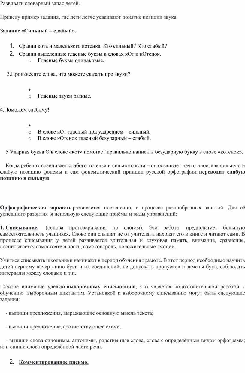 Когда ребенок сравнивает слабого котенка и сильного кота – он осваивает нечто иное, как сильную и слабую позицию фонемы и сам фонематический принцип русской орфографии: переводит слабую позицию в сильную.