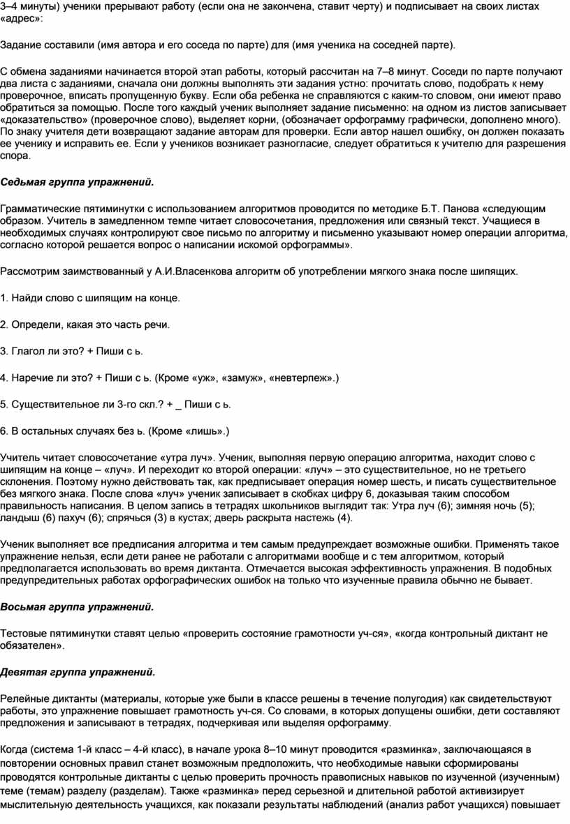 Грамматические пятиминутки с использованием алгоритмов проводится по методике Б.Т. Панова «следующим образом. Учитель в замедленном темпе читает словосочетания, предложения или связный текст. Учащиеся в необходимых случаях контролируют свое письмо по алгоритму и письменно указывают номер операции алгоритма, согласно которой решается вопрос о написании искомой орфограммы».