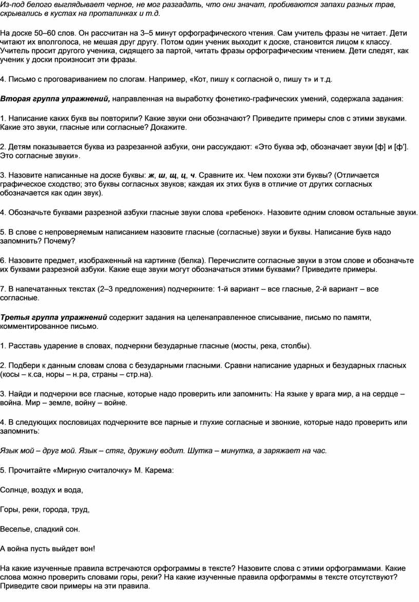 На доске 50–60 слов. Он рассчитан на 3–5 минут орфографического чтения. Сам учитель фразы не читает. Дети читают их вполголоса, не мешая друг другу. Потом один ученик выходит к доске, становится лицом к классу. Учитель просит другого ученика, сидящего за партой, читать фразы орфографическим чтением. Дети следят, как ученик у доски произносит эти фразы.
