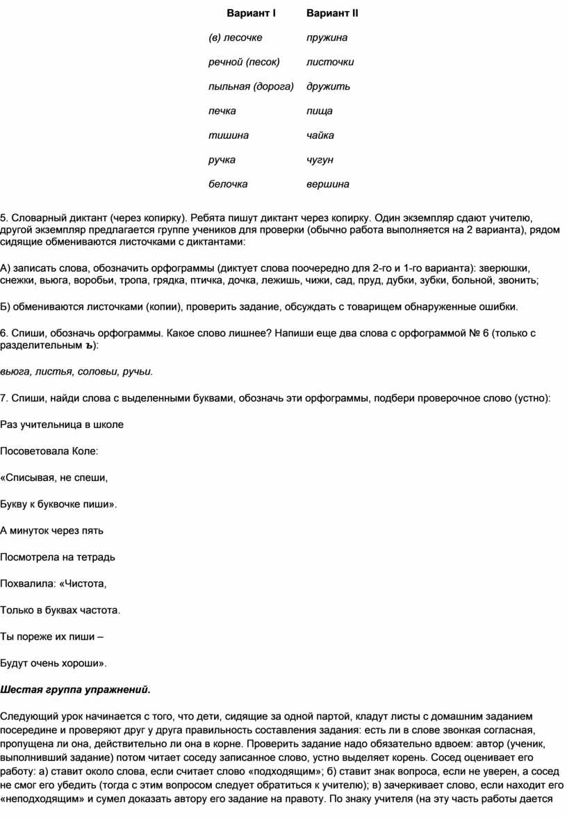 5. Словарный диктант (через копирку). Ребята пишут диктант через копирку. Один экземпляр сдают учителю, другой экземпляр предлагается группе учеников для проверки (обычно работа выполняется на 2 варианта), рядом сидящие обмениваются листочками с диктантами: