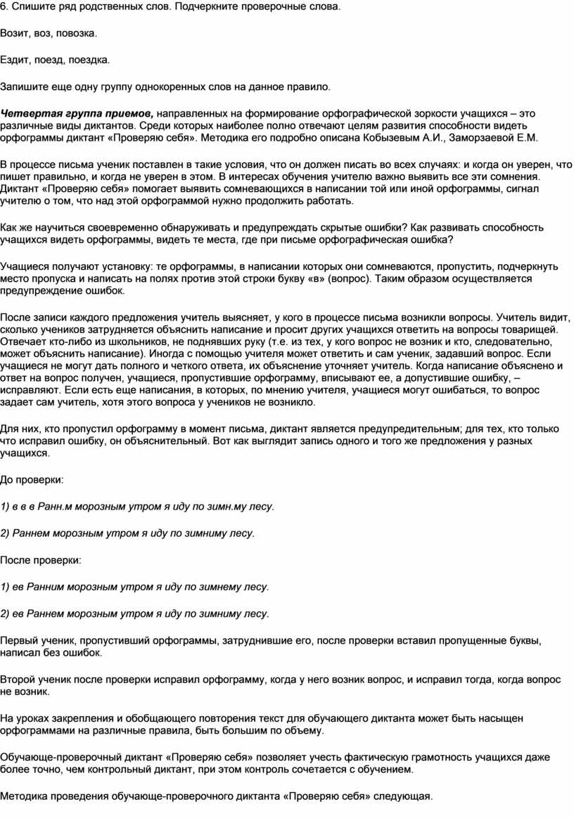 Четвертая группа приемов, направленных на формирование орфографической зоркости учащихся – это различные виды диктантов. Среди которых наиболее полно отвечают целям развития способности видеть орфограммы диктант «Проверяю себя». Методика его подробно описана Кобызевым А.И., Заморзаевой Е.М.