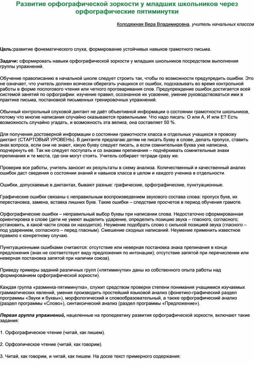Развитие орфографической зоркости у младших школьников через орфографические пятиминутки