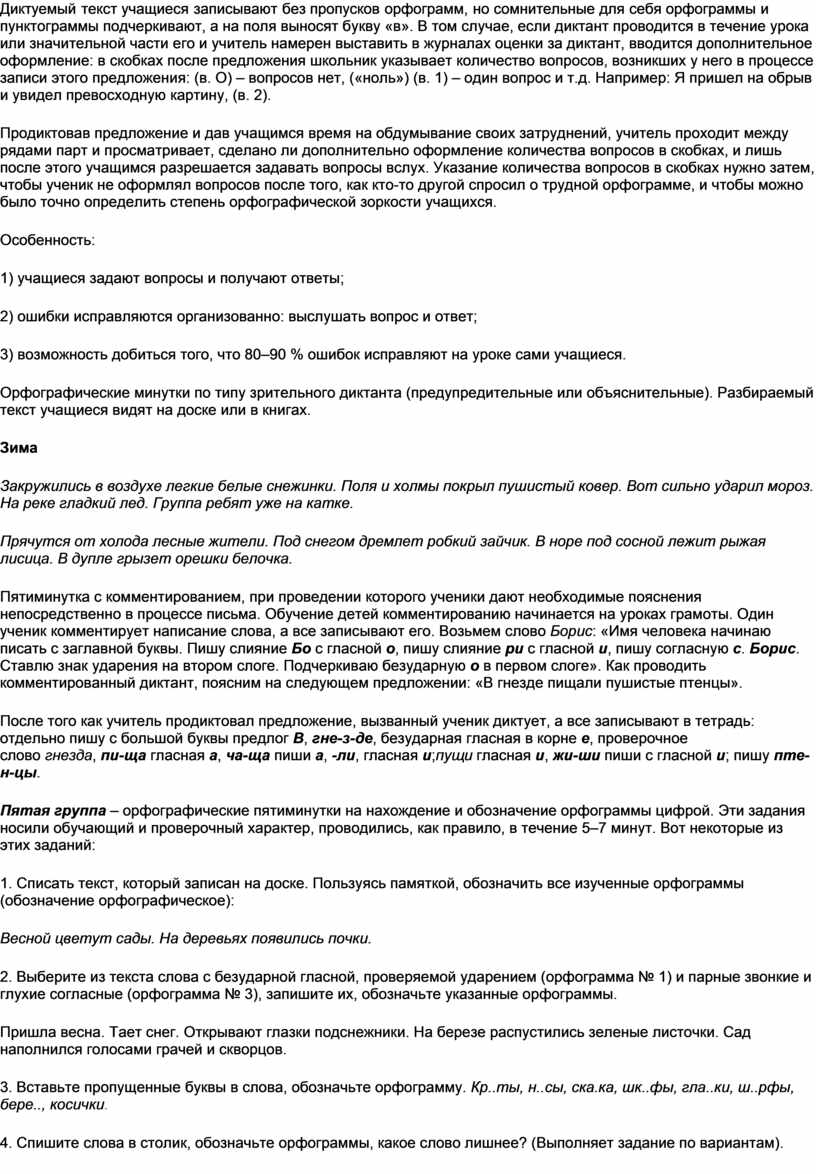 Орфографические минутки по типу зрительного диктанта (предупредительные или объяснительные). Разбираемый текст учащиеся видят на доске или в книгах.