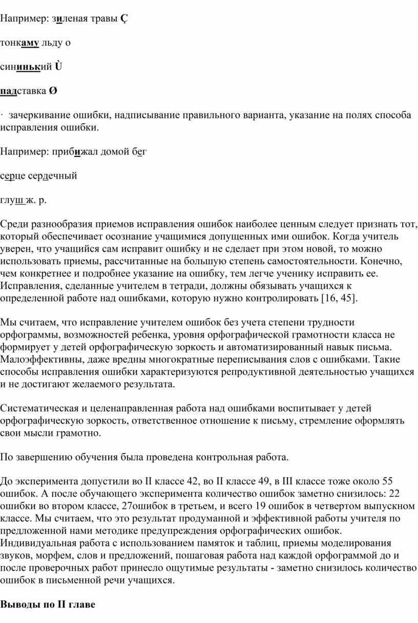 Систематическая и целенаправленная работа над ошибками воспитывает у детей орфографическую зоркость, ответственное отношение к письму, стремление оформлять свои мысли грамотно. В нашем эксперименте были использованы разнообразные приемы исправления орфографических ошибок: 1) самостоятельное отыскивание и исправление ошибок; 2) самостоятельное исправление только подчеркнутых учителем или отмеченных учителем на полях тетради условными значками орфограмм; 3) самостоятельное выписывание слов, в которых допущены ошибки; 4) составление словосочетаний и предложений со словами, в которых были допущены ошибки; 5) работа с орфографическими словарями; 6) выполнение дополнительных тренировочных упражнений и орфографических заданий.