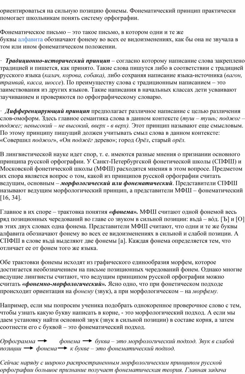 В лингвистической науке идет спор, т. е. имеются разные мнения о признании основного принципа русской орфографии. У Санкт-Петербургской фонетической школы (СПФШ) и Московской фонетической школы (МФШ) расходятся мнения в этом вопросе. Предметом их спора является вопрос о том, какой из принципов русской орфографии считать ведущим, основным – морфологический или фонематический. Представители СПФШ называют ведущим морфологический принцип, а представители МФШ – фонематический [16, 34].