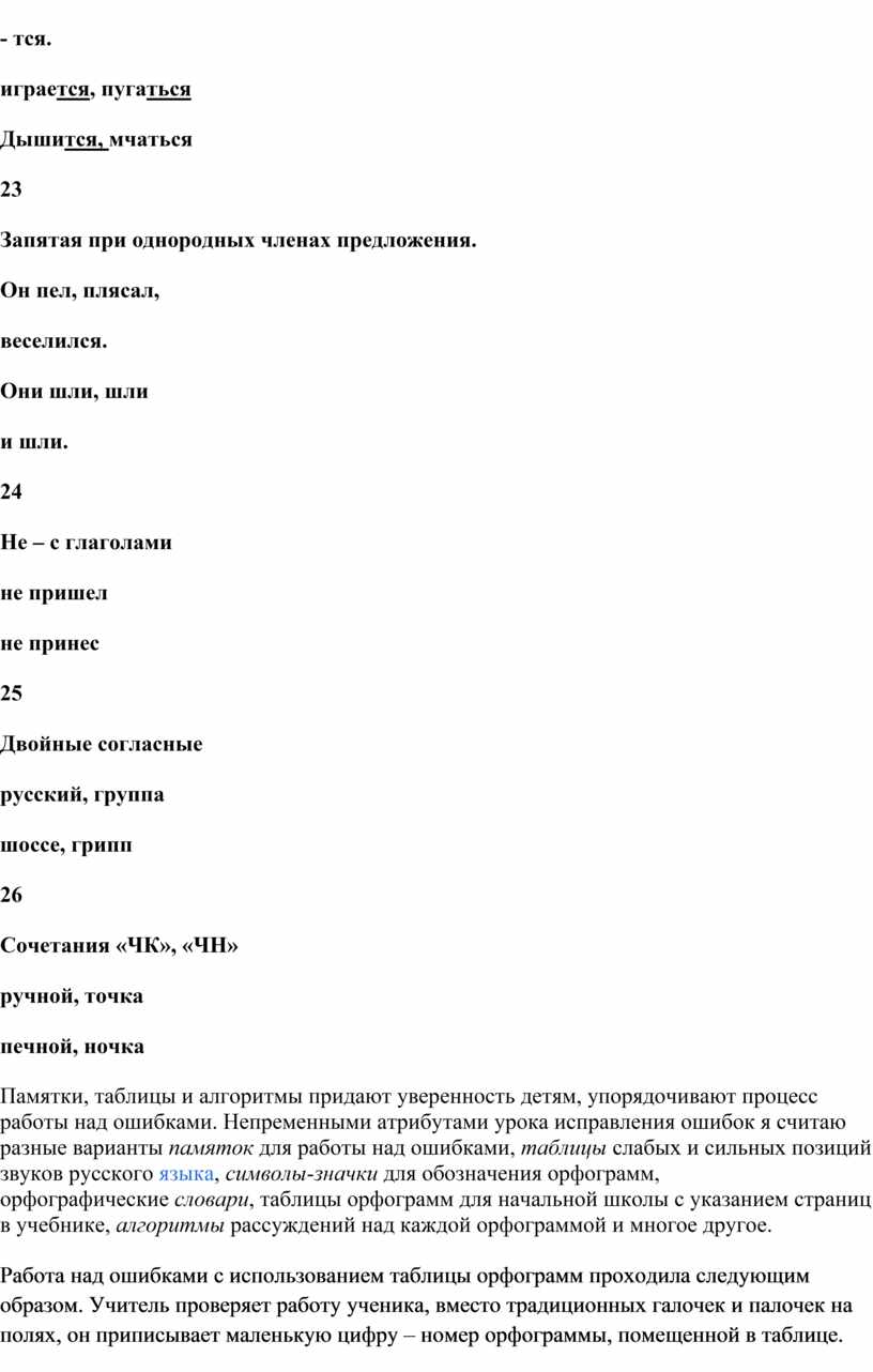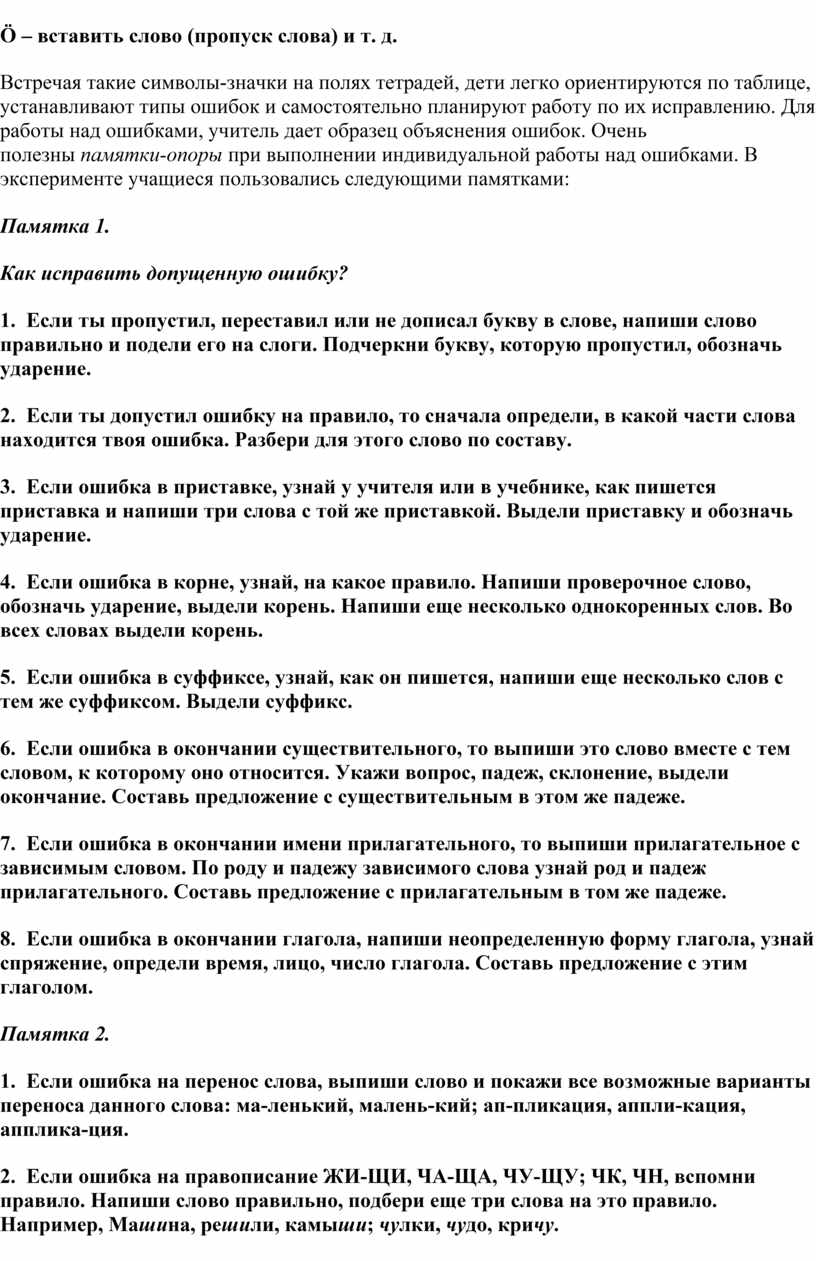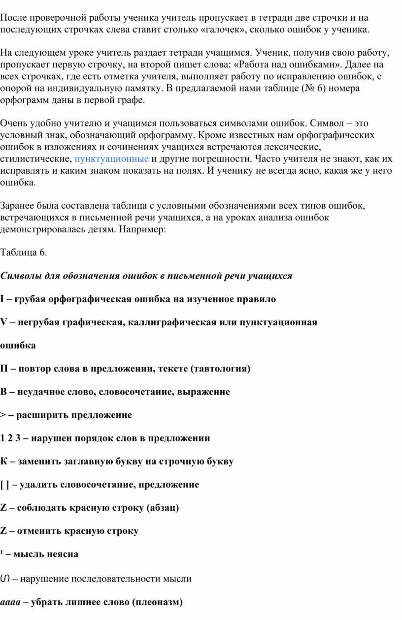 К сожалению, большинство учителей предпочитают традиционный прием указания ошибки: зачеркивание орфографической ошибки, надписывание нужной буквы, обозначение на полях условным знаком. При такой проверке не учитываются тип ошибки, ее причины, индивидуальные особенности учащихся, цель исправления ошибки, уровень овладения умением исправлять орфографические ошибки. Чем старше ученик, тем больше должна быть доля самостоятельности в работе над ошибками. Использование одного и того же приема исправления ошибок учителем приводит к тому, что учащиеся не любят работу над ошибками, делают это механически и повторно допускают одни и те же ошибки.