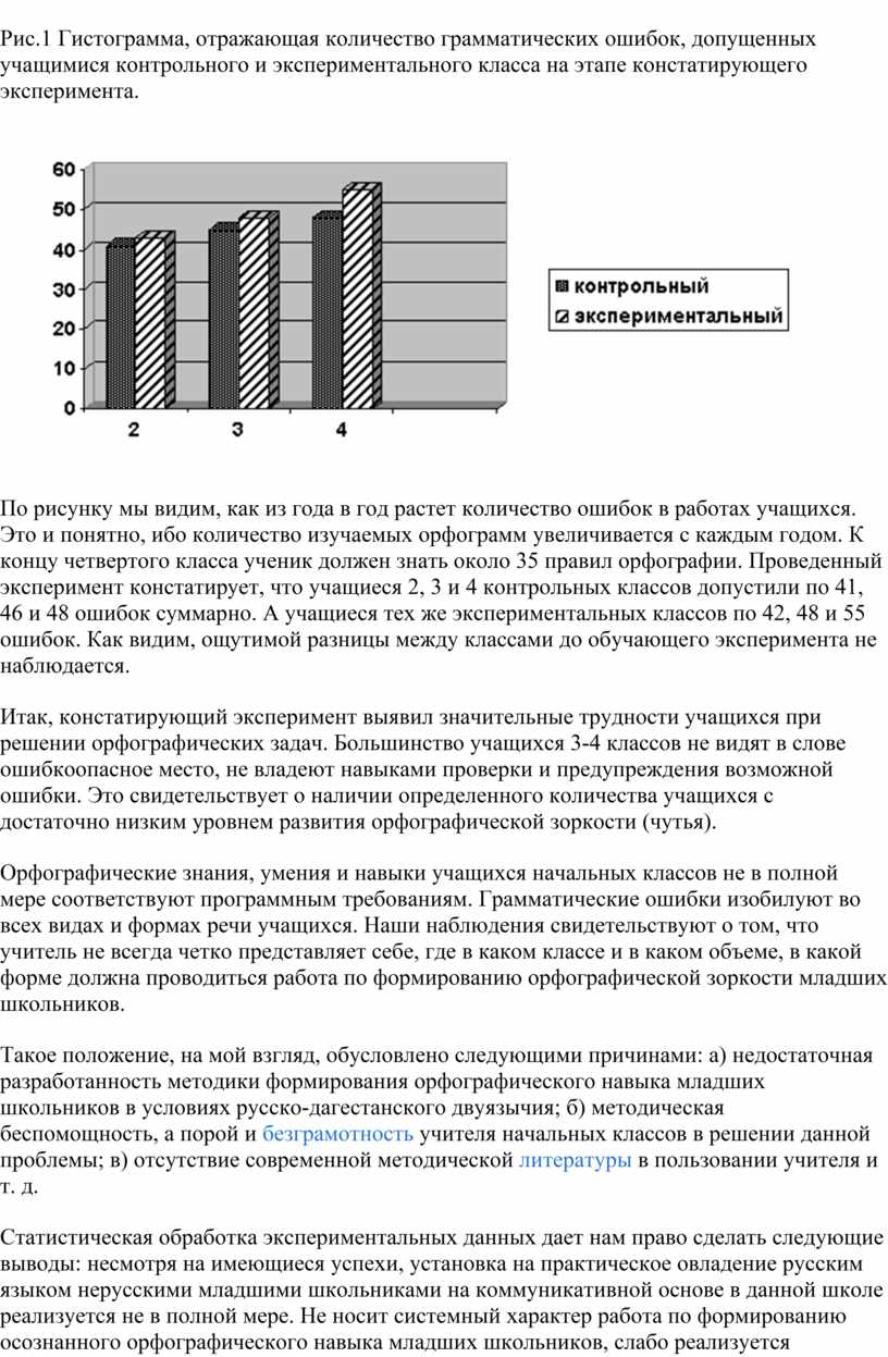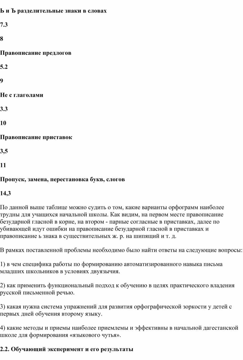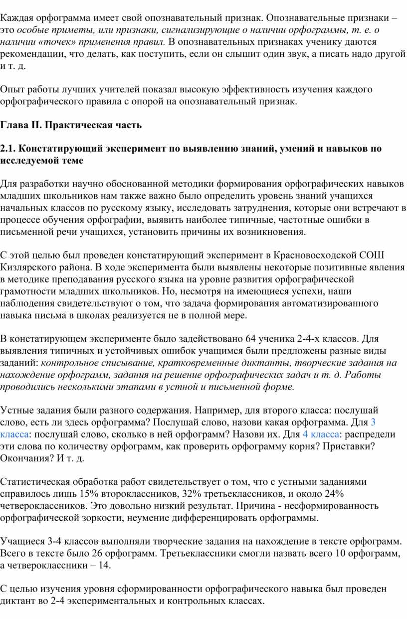 Констатирующий эксперимент, проведенный в начальных классах МКОУ «Уркарахского МЛ» Дахадаевского района подтвердил нашу гипотезу о наличии в письменной речи учащихся устойчивых орфографических ошибок, требующих продуманной и эффективной профилактической работы. Необходимость такой работы заставило нас пересмотреть традиционную методику формирования орфографического навыка, пробовать новые более прогрессивные технологии, искать и экспериментировать.