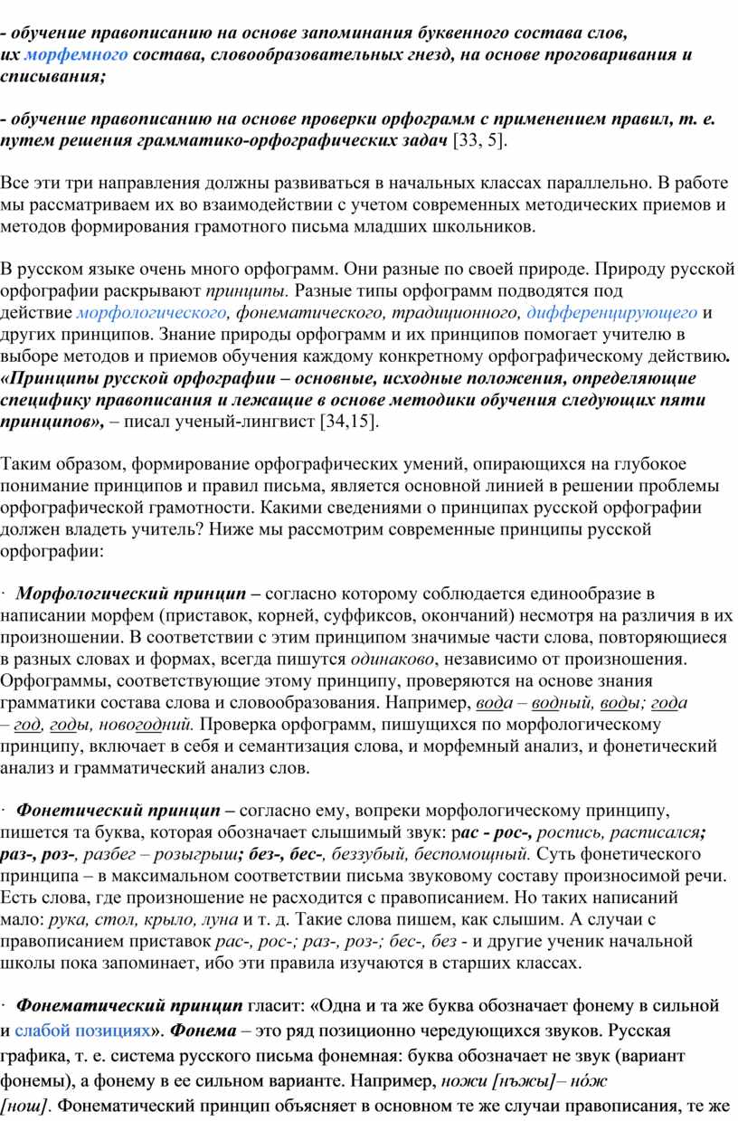 Таким образом, формирование орфографических умений, опирающихся на глубокое понимание принципов и правил письма, является основной линией в решении проблемы орфографической грамотности. Какими сведениями о принципах русской орфографии должен владеть учитель? Ниже мы рассмотрим современные принципы русской орфографии: