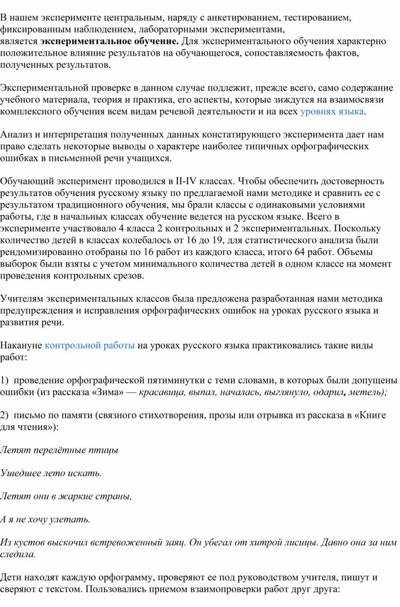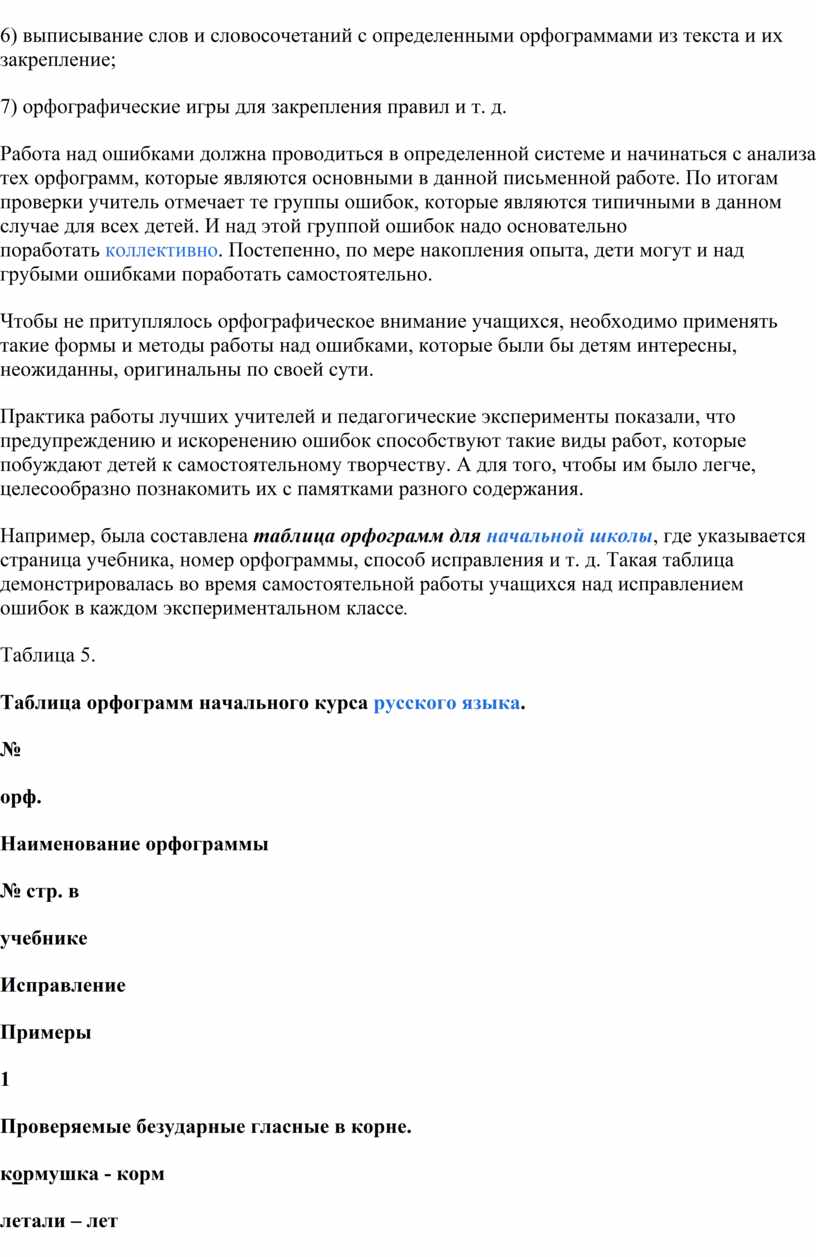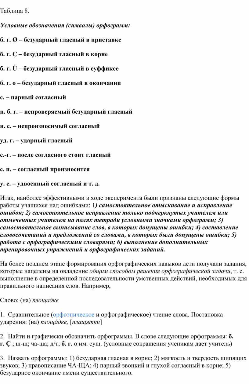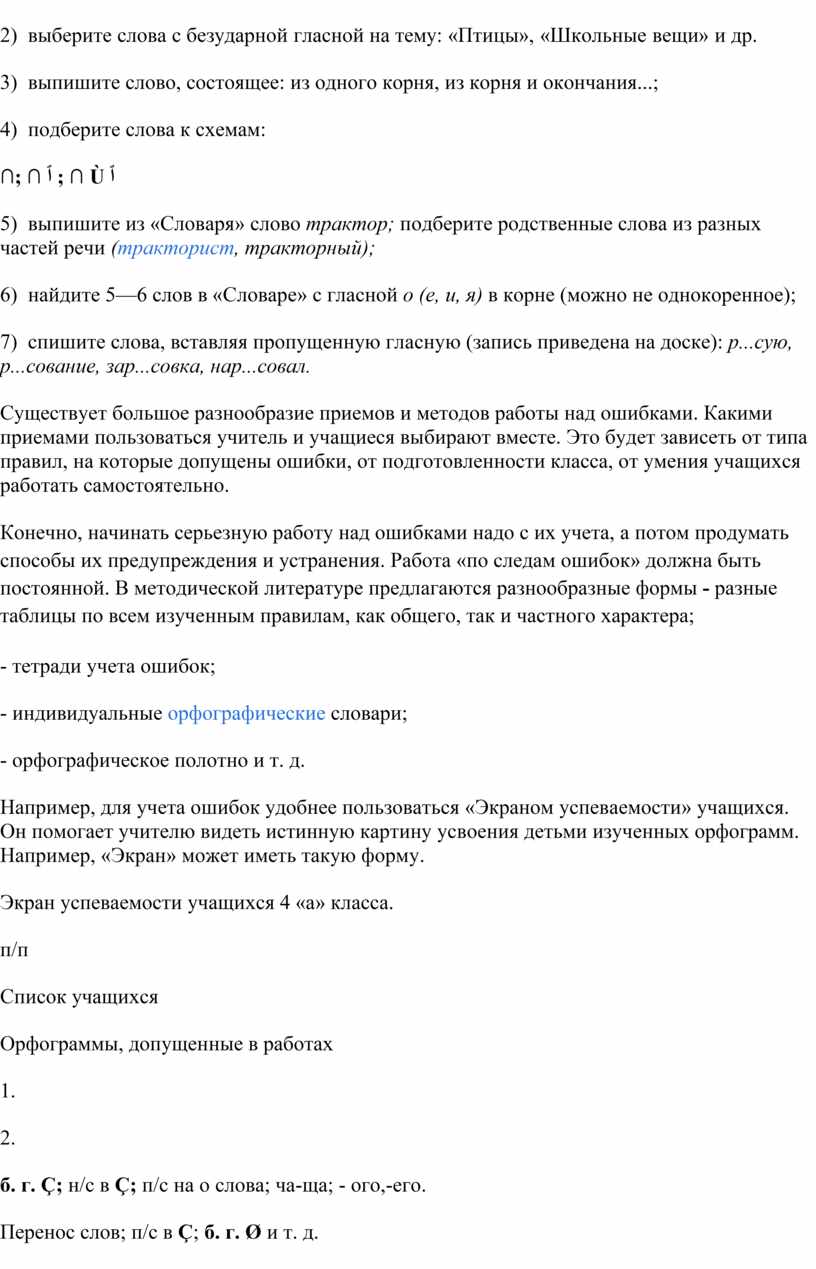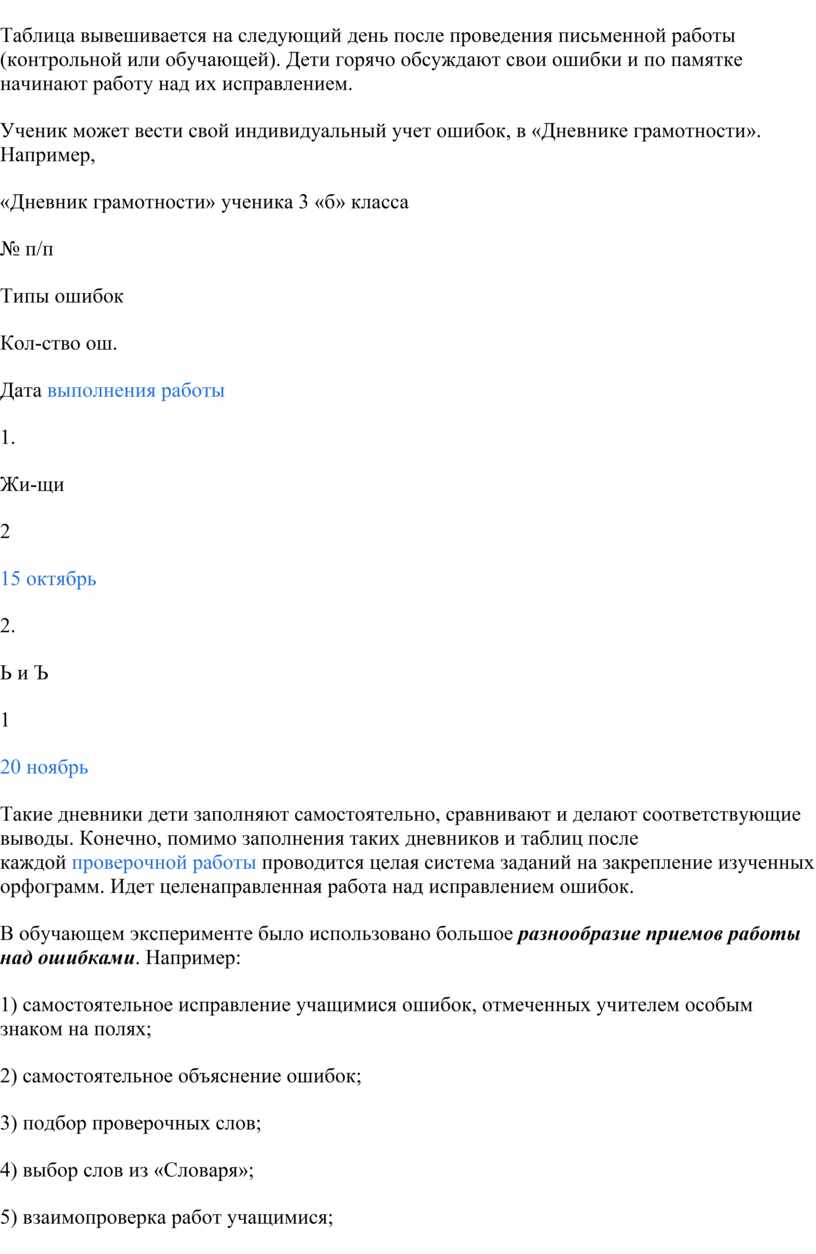 Итак, наиболее эффективными в ходе эксперимента были признаны следующие формы работы учащихся над ошибками: 1) самостоятельное отыскивание и исправление ошибок; 2) самостоятельное исправление только подчеркнутых учителем или отмеченных учителем на полях тетради условными значками орфограмм; 3) самостоятельное выписывание слов, в которых допущены ошибки; 4) составление словосочетаний и предложений со словами, в которых были допущены ошибки; 5) работа с орфографическими словарями; 6) выполнение дополнительных тренировочных упражнений и орфографических заданий.