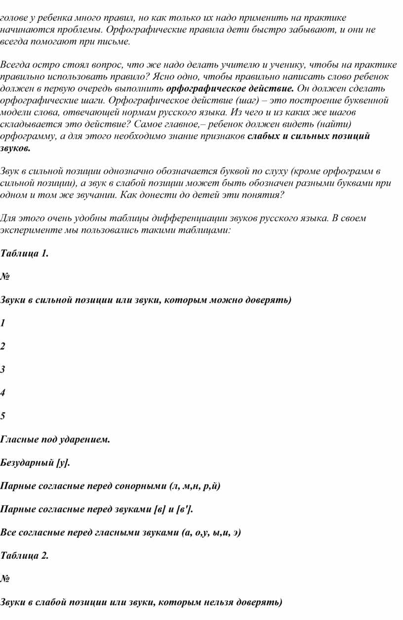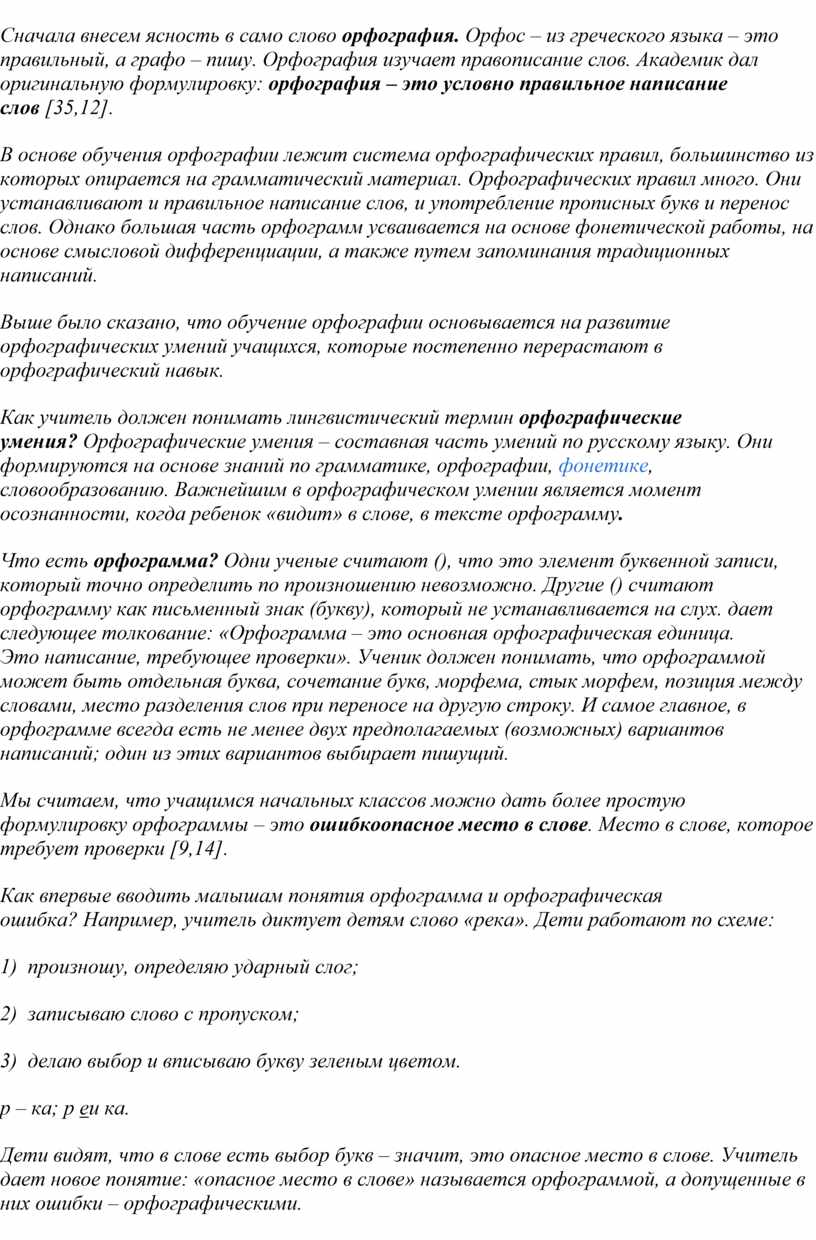 Поскольку формирование орфографических навыков опирается на лингвистические сведения и специфические понятия русской орфографии, мы считаем, что учитель должен владеть определенными теоретическими сведениями в этой области. С этой целью в работе последовательно вводятся лингвистические понятия орфограмма, слабые и сильные позиции звуков, орфографическое действие, орфографическая задача, орфографические умения, орфографический навык и т. д.