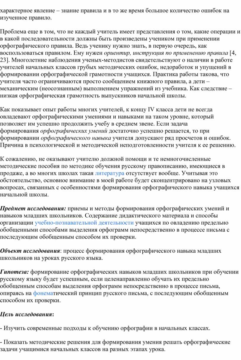 Предмет исследования: приемы и методы формирования орфографических умений и навыков младших школьников. Содержание дидактического материала и способы организации учебно-познавательной деятельности учащихся по овладению предельно обобщенными способами выделения орфограмм непосредственно в процессе письма с последующим обобщенным способом их проверки.
