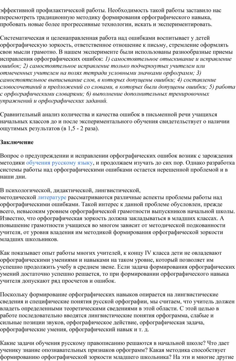 В психологической, дидактической, лингвистической, методической литературе рассматриваются различные аспекты проблемы работы над орфографическими ошибками. Такой интерес к данной проблеме обусловлен, прежде всего, невысоким уровнем орфографической грамотности выпускников начальной школы. Известно, что орфографическая зоркость должна закладываться в младших классах. А повышение грамотности учащихся во многом зависит от методической подкованности учителя, от уровня владения им методикой формирования орфографической зоркости младших школьников.