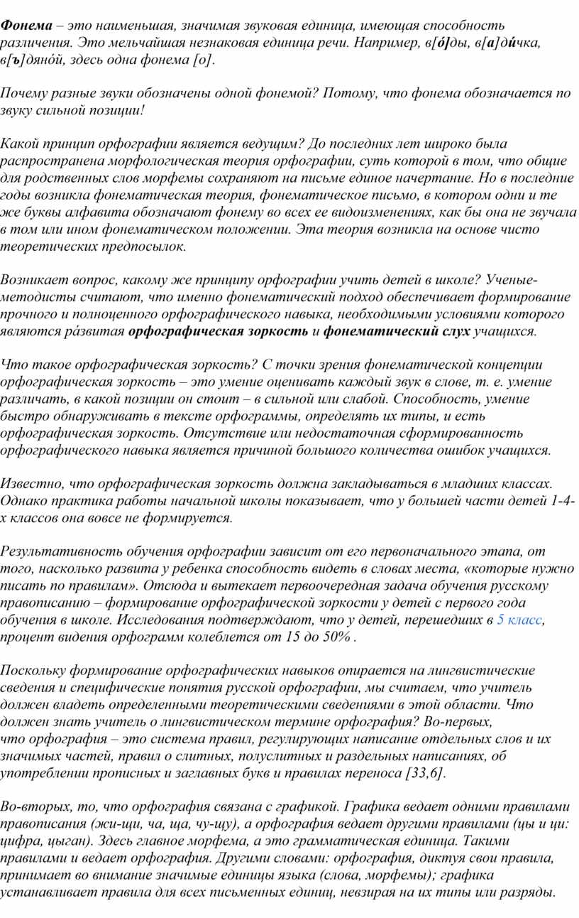 Возникает вопрос, какому же принципу орфографии учить детей в школе? Ученые-методисты считают, что именно фонематический подход обеспечивает формирование прочного и полноценного орфографического навыка, необходимыми условиями которого являются рáзвитая орфографическая зоркость и фонематический слух учащихся.
