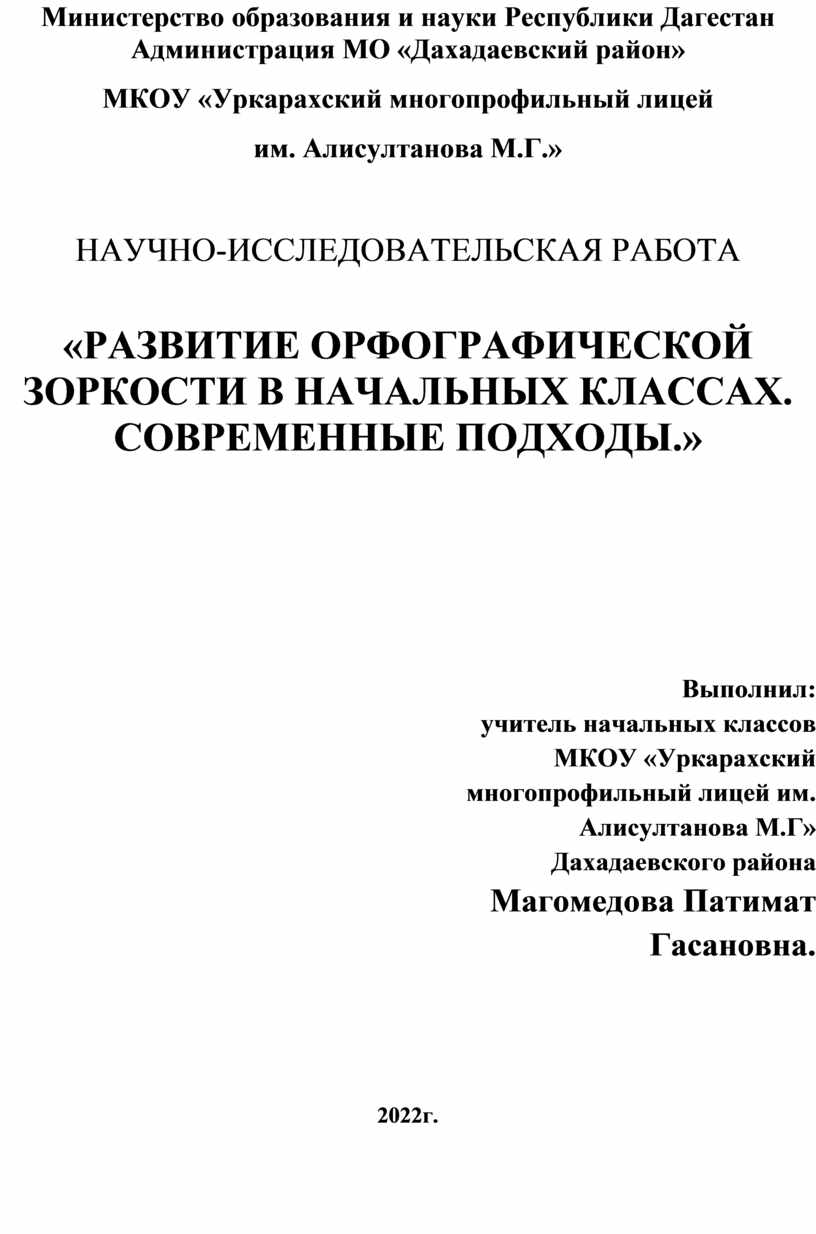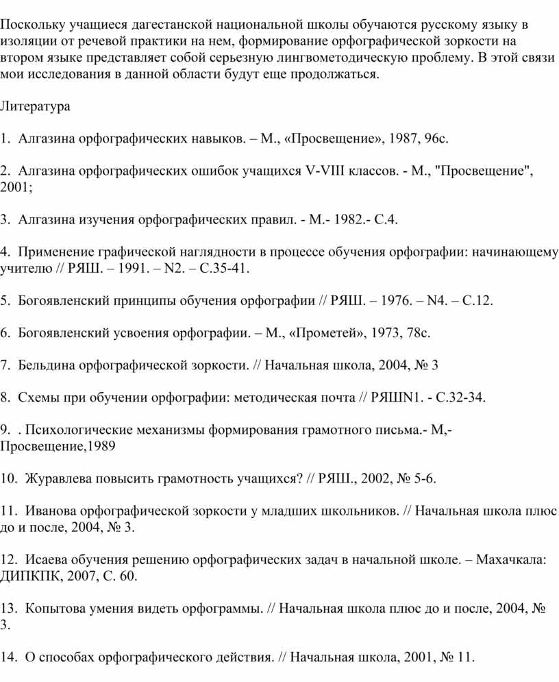 Поскольку учащиеся дагестанской национальной школы обучаются русскому языку в изоляции от речевой практики на нем, формирование орфографической зоркости на втором языке представляет собой серьезную лингвометодическую проблему. В этой связи мои исследования в данной области будут еще продолжаться.