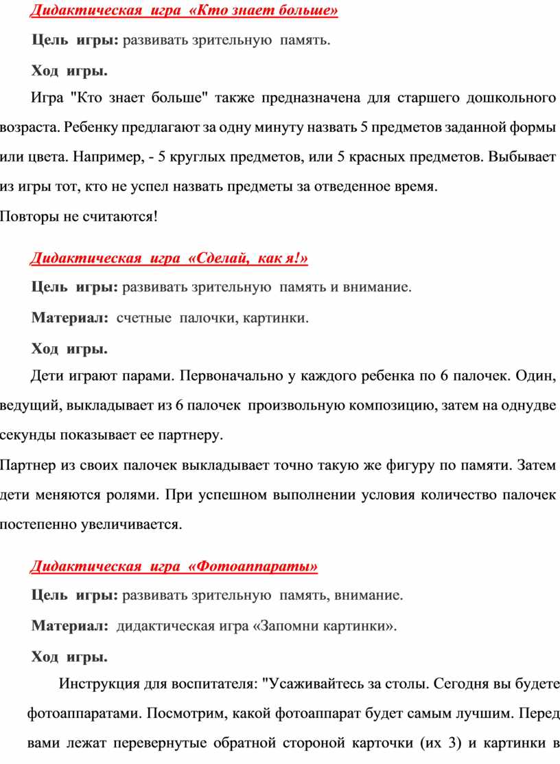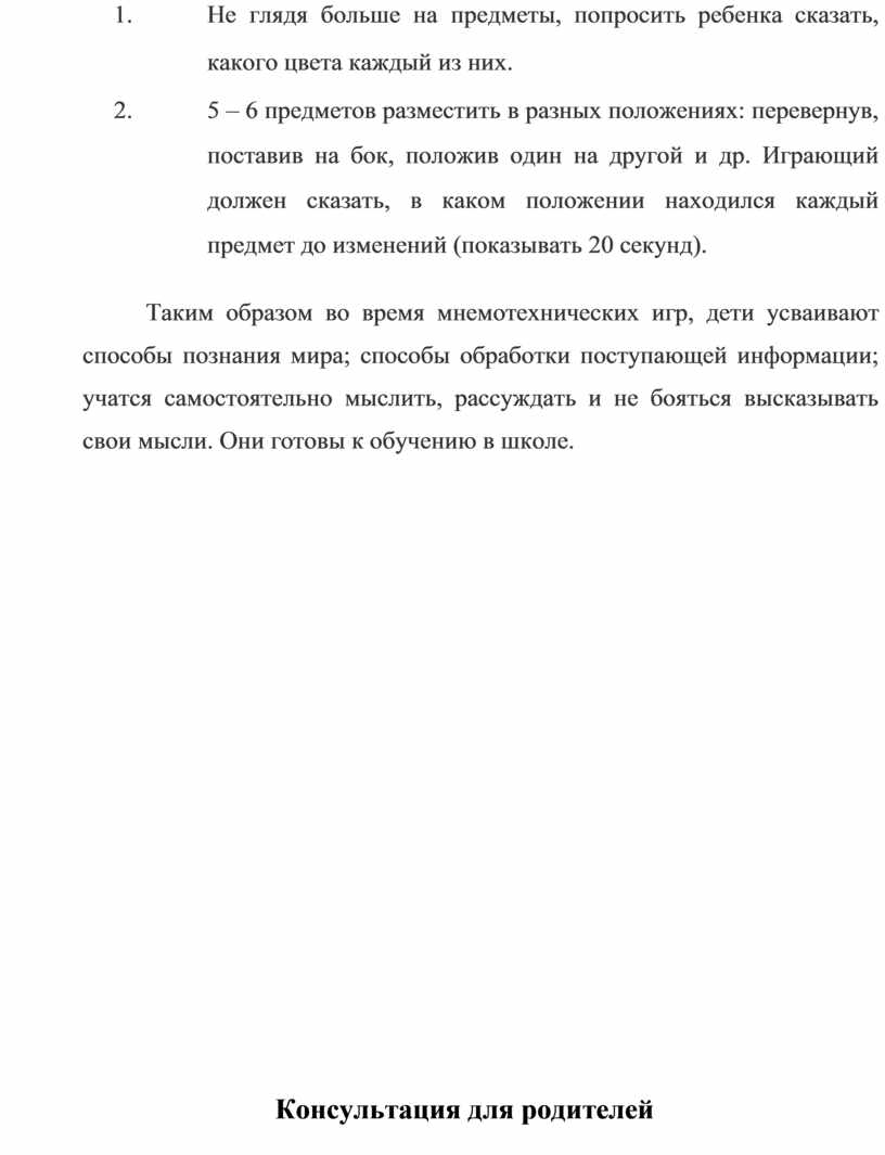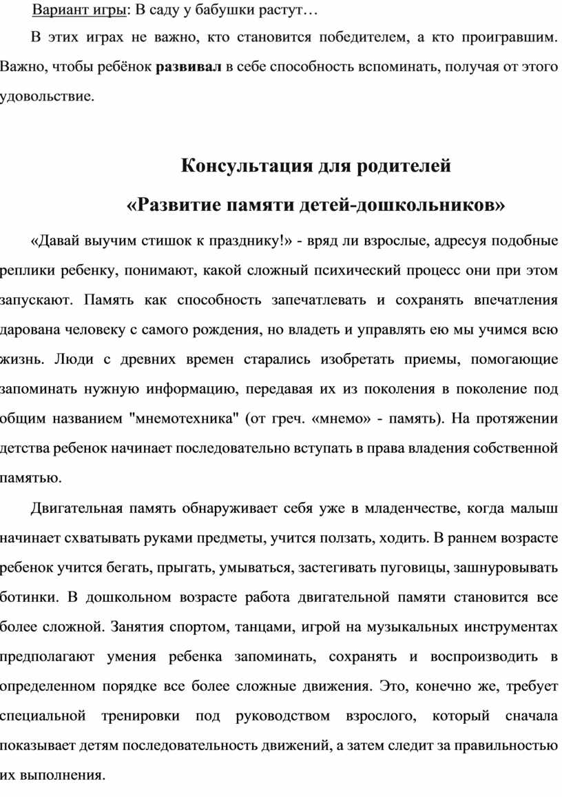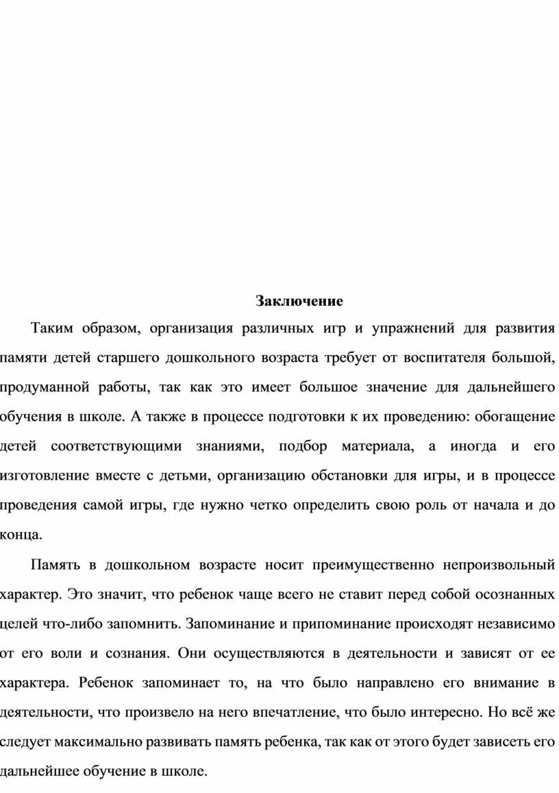 Таким образом, организация различных игр и упражнений для развития памяти детей старшего дошкольного возраста требует от воспитателя большой, продуманной работы, так как это имеет большое значение для дальнейшего обучения в школе. А также в процессе подготовки к их проведению: обогащение детей соответствующими знаниями, подбор материала, а иногда и его изготовление вместе с детьми, организацию обстановки для игры, и в процессе проведения самой игры, где нужно четко определить свою роль от начала и до конца.