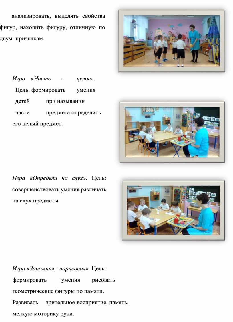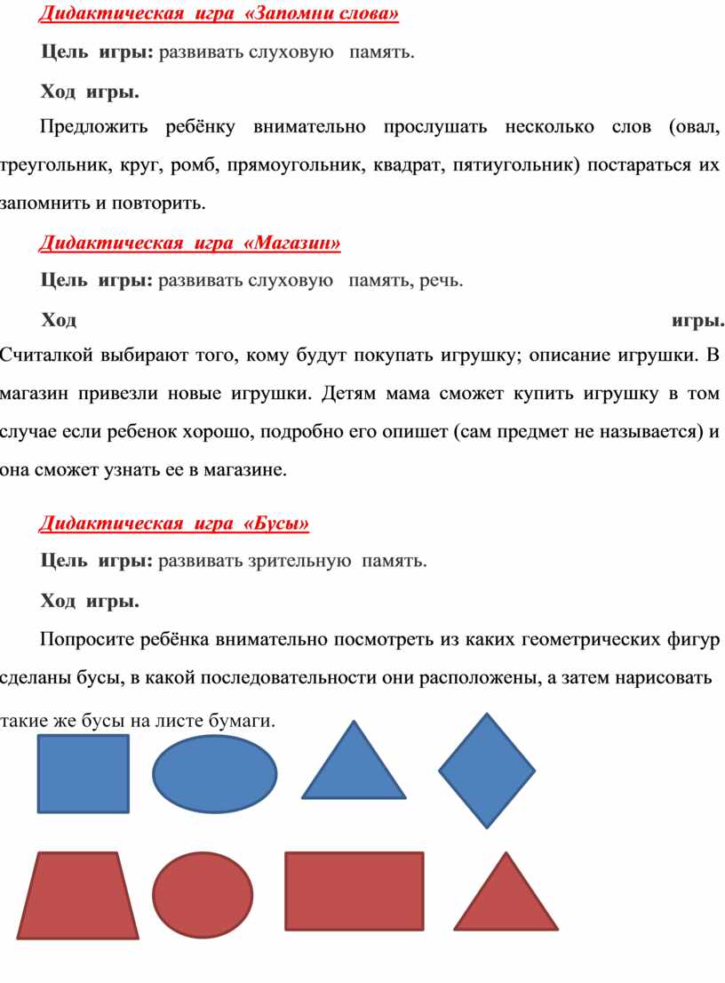 Игра «Запомнил - нарисовал». Цель: формировать умения рисовать геометрические фигуры по памяти. Развивать зрительное восприятие, память, мелкую моторику руки.