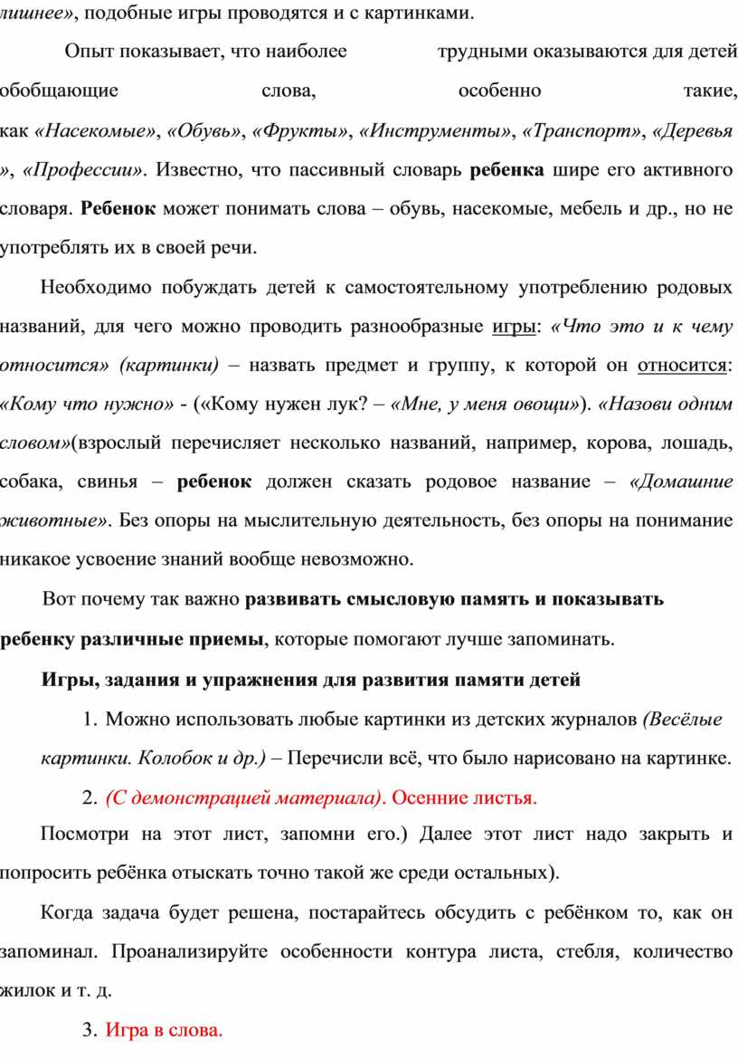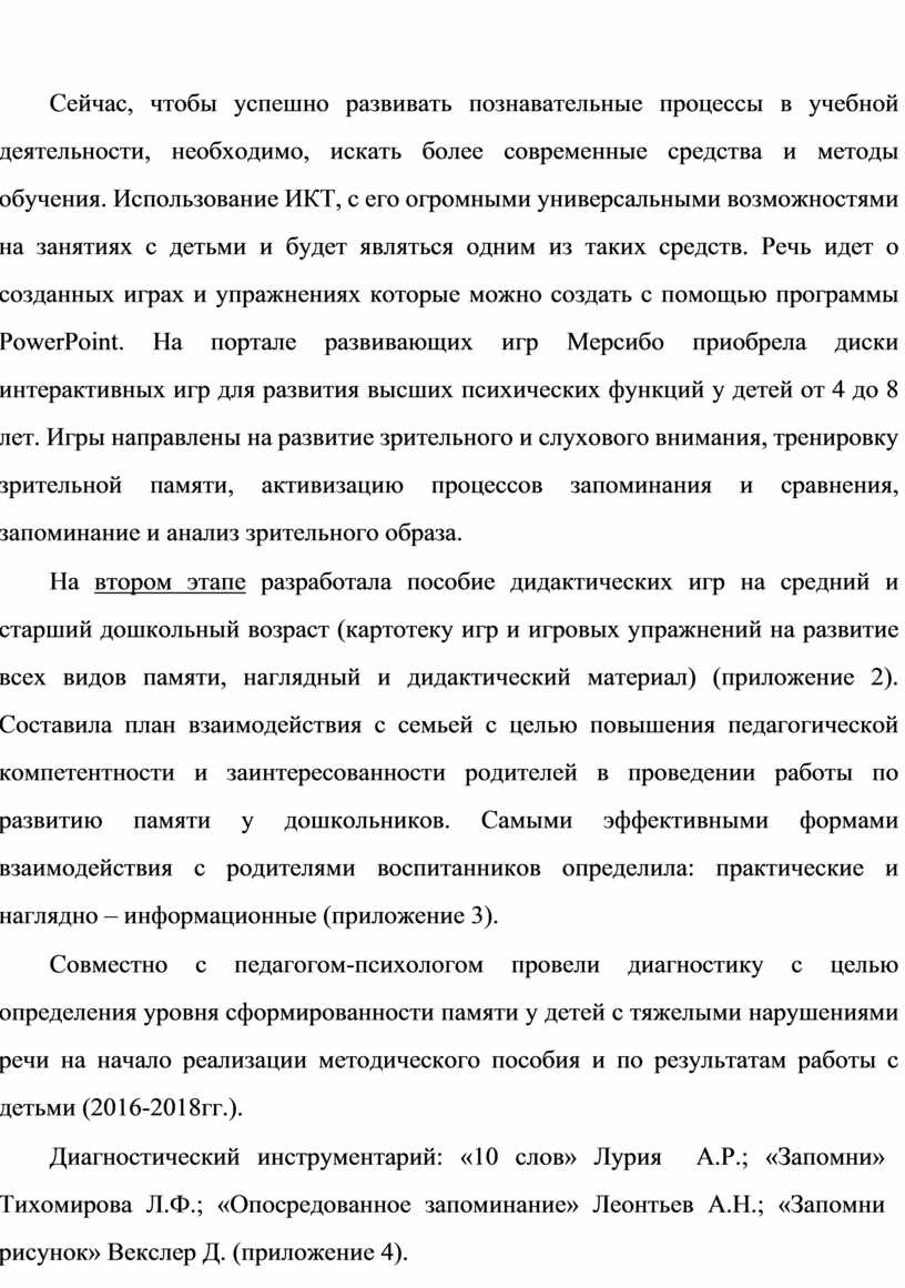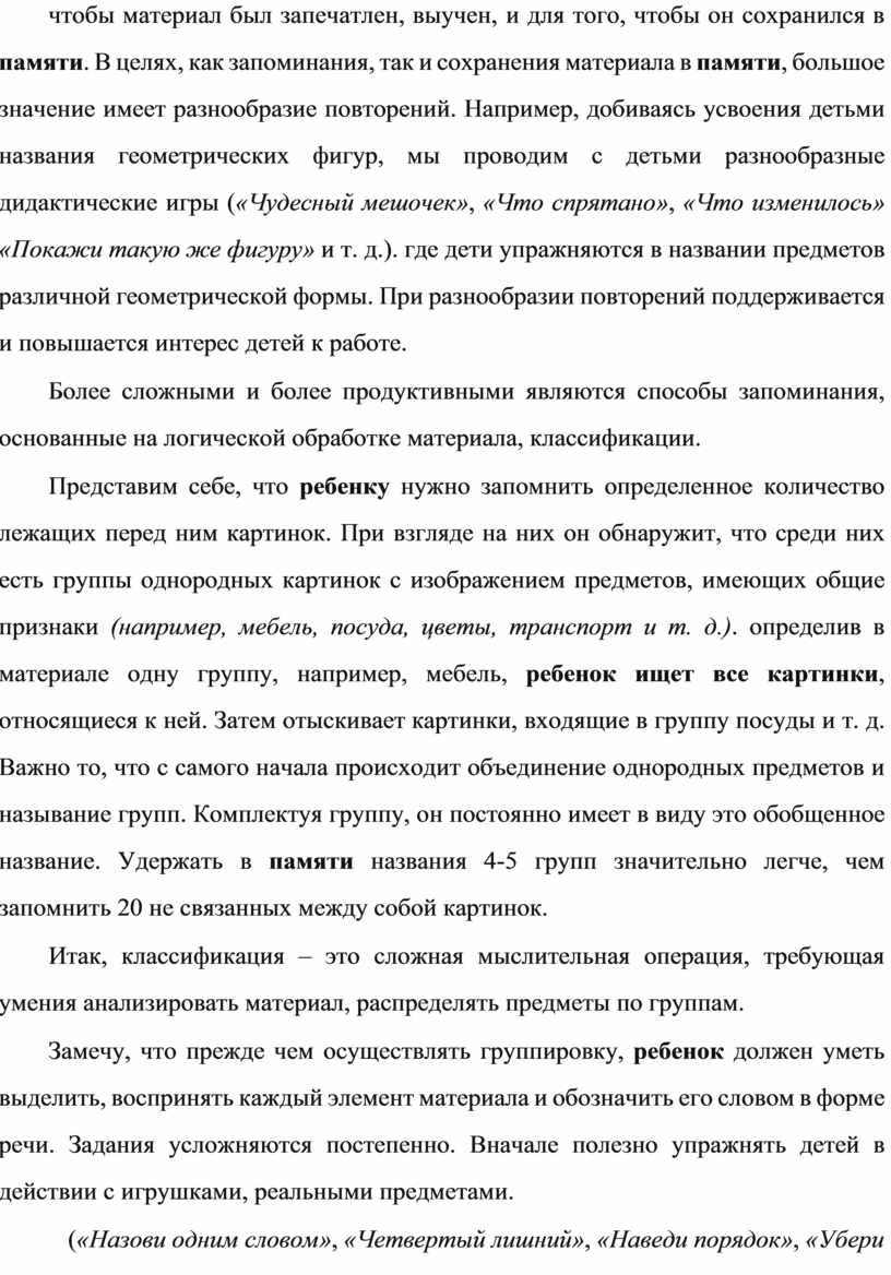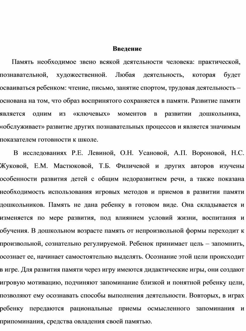 В исследованиях Р.Е. Левиной, О.Н. Усановой, А.П. Вороновой, Н.С. Жуковой, Е.М. Мастюковой, Т.Б. Филичевой и других авторов изучены особенности развития детей с общим недоразвитием речи, а также показана необходимость использования игровых методов и приемов в развитии памяти дошкольников. Память не дана ребенку в готовом виде. Она складывается и изменяется по мере развития, под влиянием условий жизни, воспитания и обучения. В дошкольном возрасте память от непроизвольной формы переходит к произвольной, сознательно регулируемой. Ребенок принимает цель – запомнить, осознает ее, начинает самостоятельно выделять. Осознание этой цели происходит в игре. Для развития памяти через игру имеются дидактические игры, они создают игровую мотивацию, подчиняют запоминание близкой и понятной ребенку цели, позволяют ему осознавать способы выполнения деятельности. Вовторых, в играх ребенку передаются рациональные приемы осмысленного запоминания и припоминания, средства овладения своей памятью.