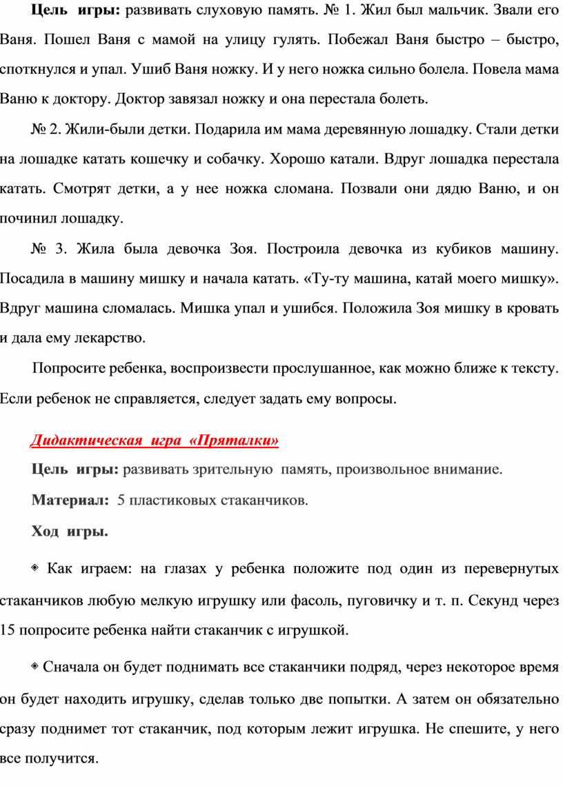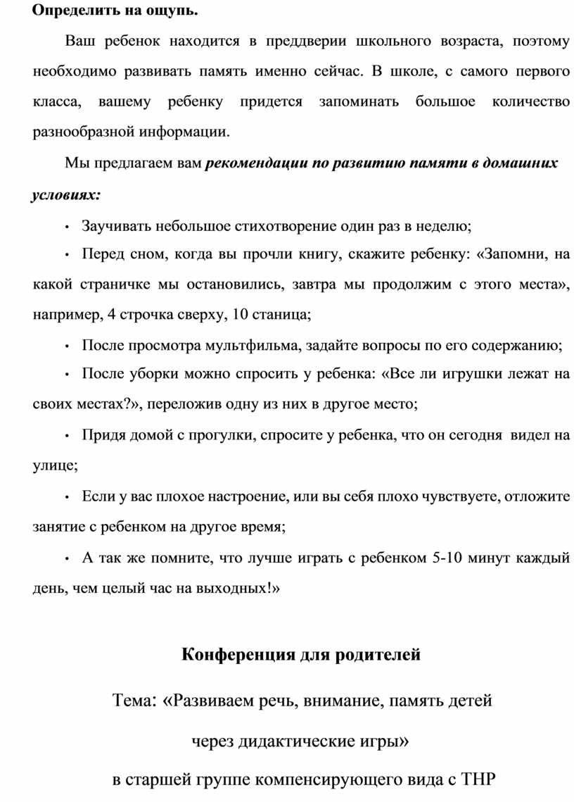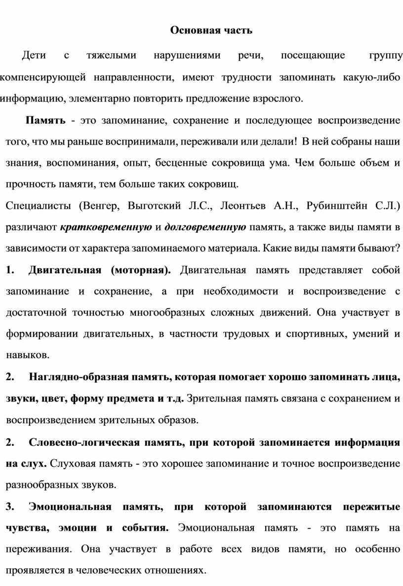 В исследованиях Р.Е. Левиной, О.Н. Усановой, А.П. Вороновой, Н.С. Жуковой, Е.М. Мастюковой, Т.Б. Филичевой и других авторов изучены особенности развития детей с общим недоразвитием речи, а также показана необходимость использования игровых методов и приемов в развитии памяти дошкольников. Память не дана ребенку в готовом виде. Она складывается и изменяется по мере развития, под влиянием условий жизни, воспитания и обучения. В дошкольном возрасте память от непроизвольной формы переходит к произвольной, сознательно регулируемой. Ребенок принимает цель – запомнить, осознает ее, начинает самостоятельно выделять. Осознание этой цели происходит в игре. Для развития памяти через игру имеются дидактические игры, они создают игровую мотивацию, подчиняют запоминание близкой и понятной ребенку цели, позволяют ему осознавать способы выполнения деятельности. Вовторых, в играх ребенку передаются рациональные приемы осмысленного запоминания и припоминания, средства овладения своей памятью.