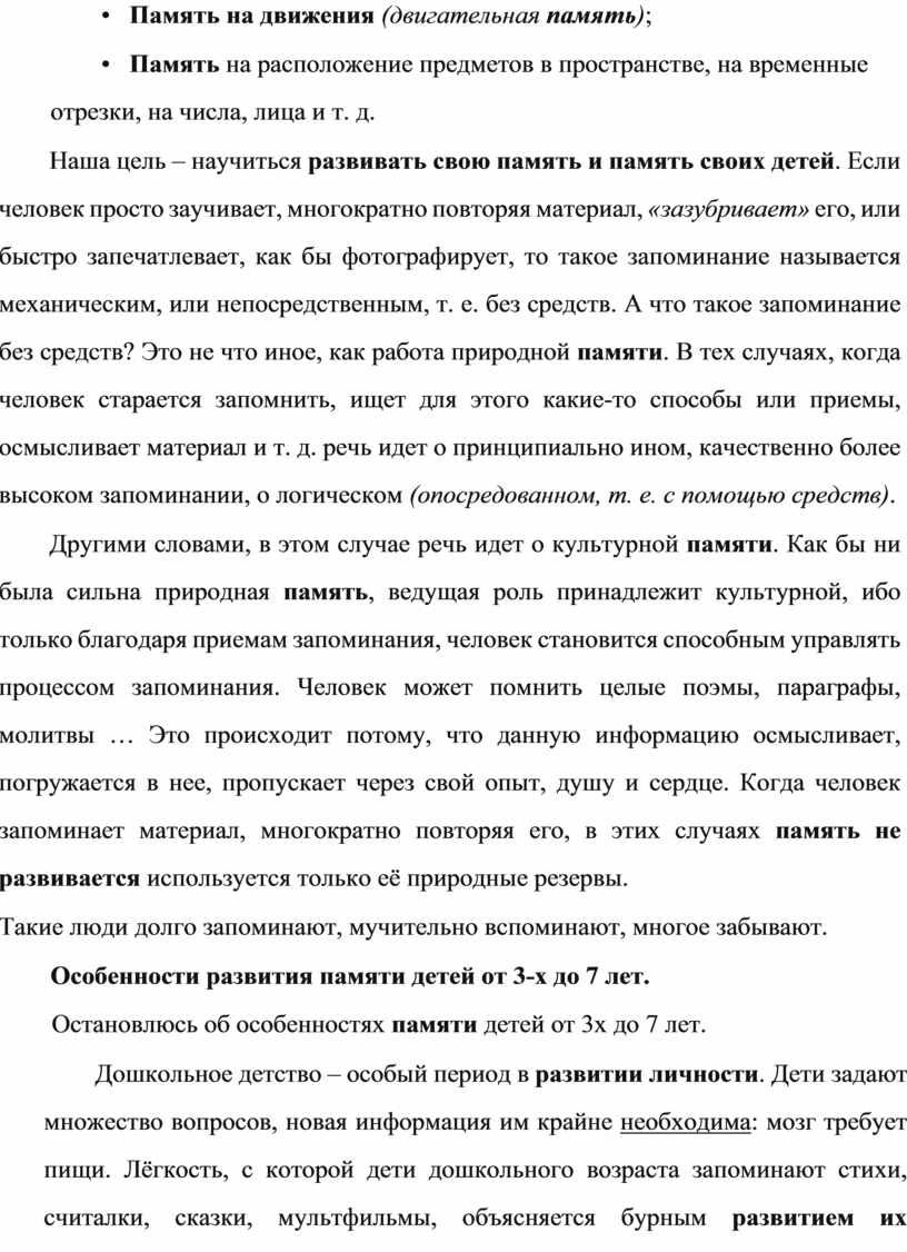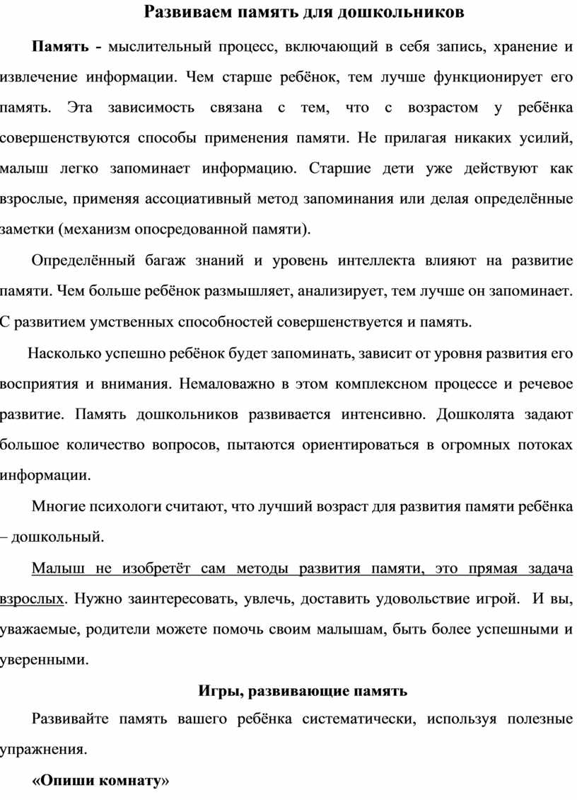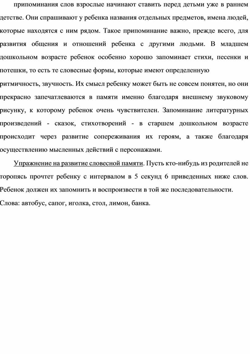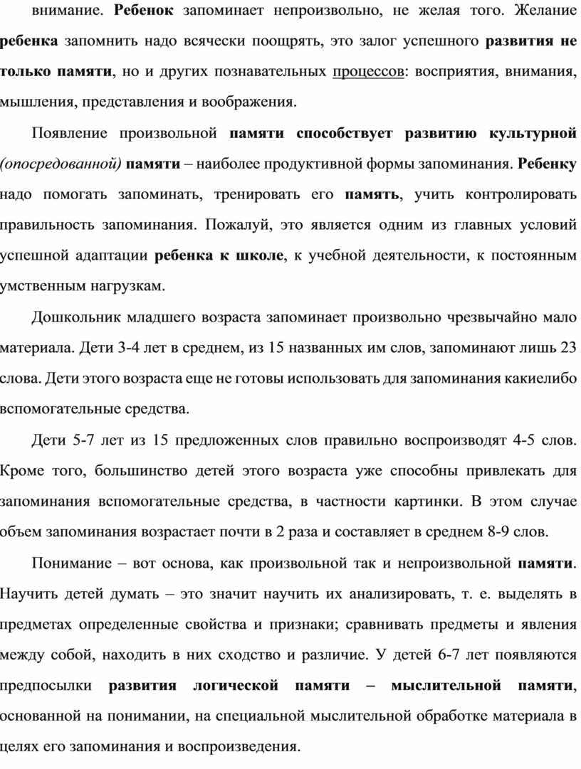 Память в дошкольном возрасте носит преимущественно непроизвольный характер. Это значит, что ребенок чаще всего не ставит перед собой осознанных целей что-либо запомнить. Запоминание и припоминание происходят независимо от его воли и сознания. Они осуществляются в деятельности и зависят от ее характера. Ребенок запоминает то, на что было направлено его внимание в деятельности, что произвело на него впечатление, что было интересно. Но всё же следует максимально развивать память ребенка, так как от этого будет зависеть его дальнейшее обучение в школе.