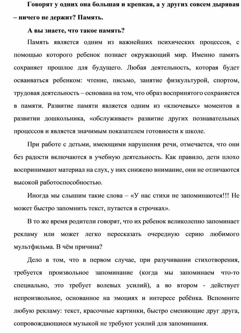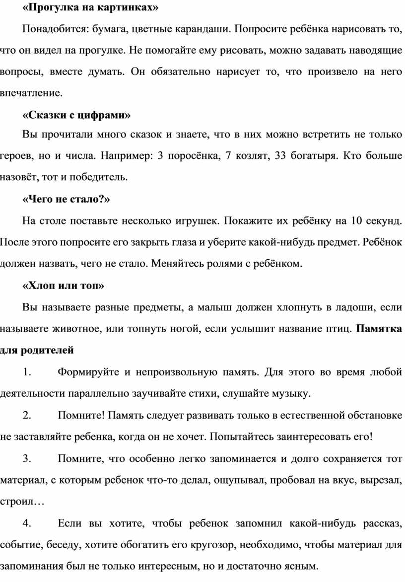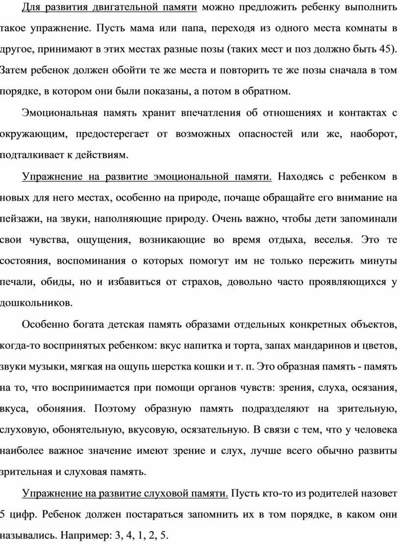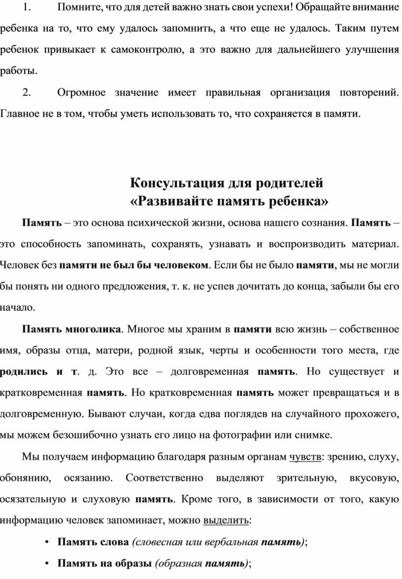 Память в дошкольном возрасте носит преимущественно непроизвольный характер. Это значит, что ребенок чаще всего не ставит перед собой осознанных целей что-либо запомнить. Запоминание и припоминание происходят независимо от его воли и сознания. Они осуществляются в деятельности и зависят от ее характера. Ребенок запоминает то, на что было направлено его внимание в деятельности, что произвело на него впечатление, что было интересно. Но всё же следует максимально развивать память ребенка, так как от этого будет зависеть его дальнейшее обучение в школе.