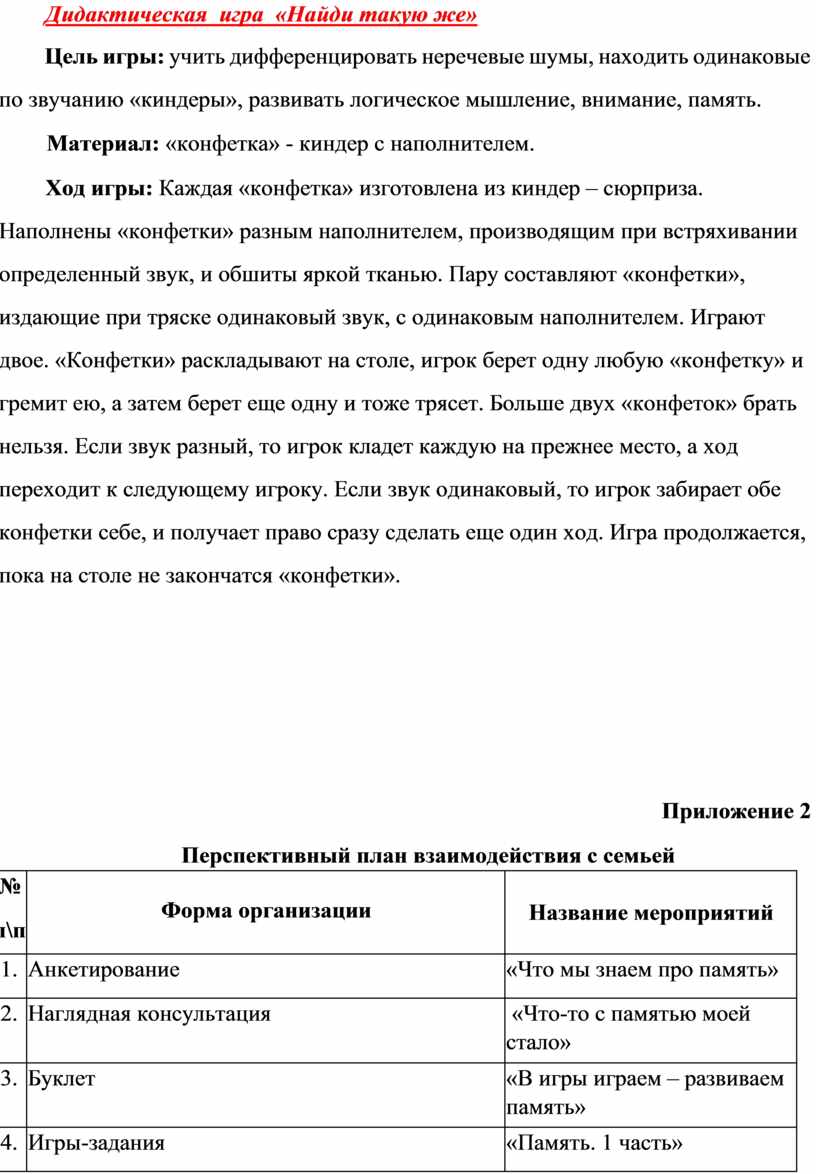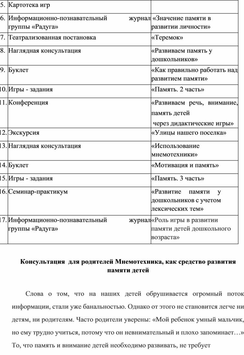 На втором этапе разработала пособие дидактических игр на средний и старший дошкольный возраст (картотеку игр и игровых упражнений на развитие всех видов памяти, наглядный и дидактический материал) (приложение 2). Составила план взаимодействия с семьей с целью повышения педагогической компетентности и заинтересованности родителей в проведении работы по развитию памяти у дошкольников. Самыми эффективными формами взаимодействия с родителями воспитанников определила: практические и наглядно – информационные (приложение 3).