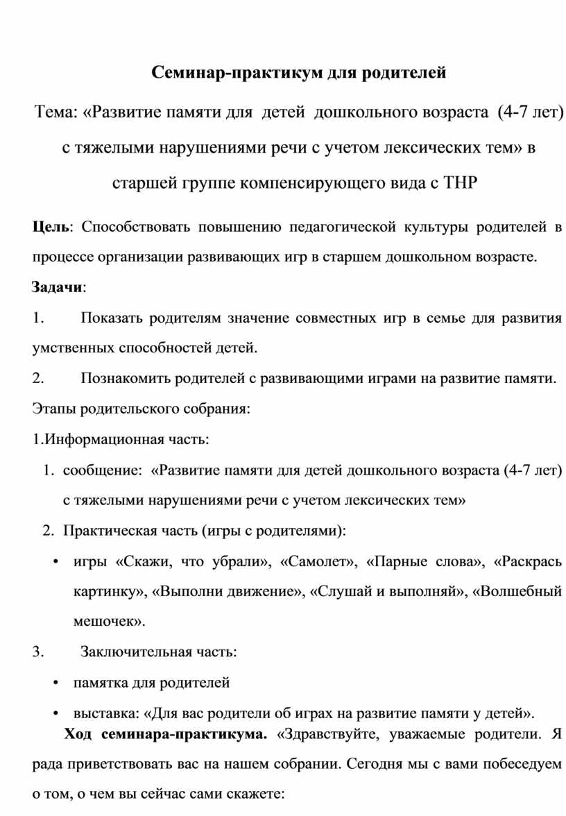 Предлагаю вашему вниманию методическое пособие, в котором представлена система работы по развитию памяти с учетом лексических тем для детей с тяжелыми нарушениями речи (4-7 лет). Подобранные игры в методическом пособии содержат все необходимые условия, способствующие развитию целенаправленной памяти ребенка. Пособие рассчитано на совместную работу взрослого и ребенка. Необходимо отметить, что регулярное использование дидактических игр, направленно на развитие (решение задач):