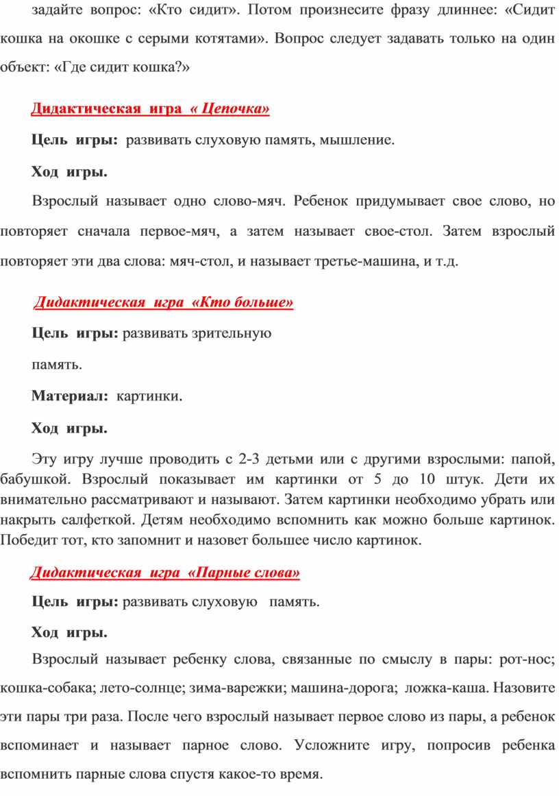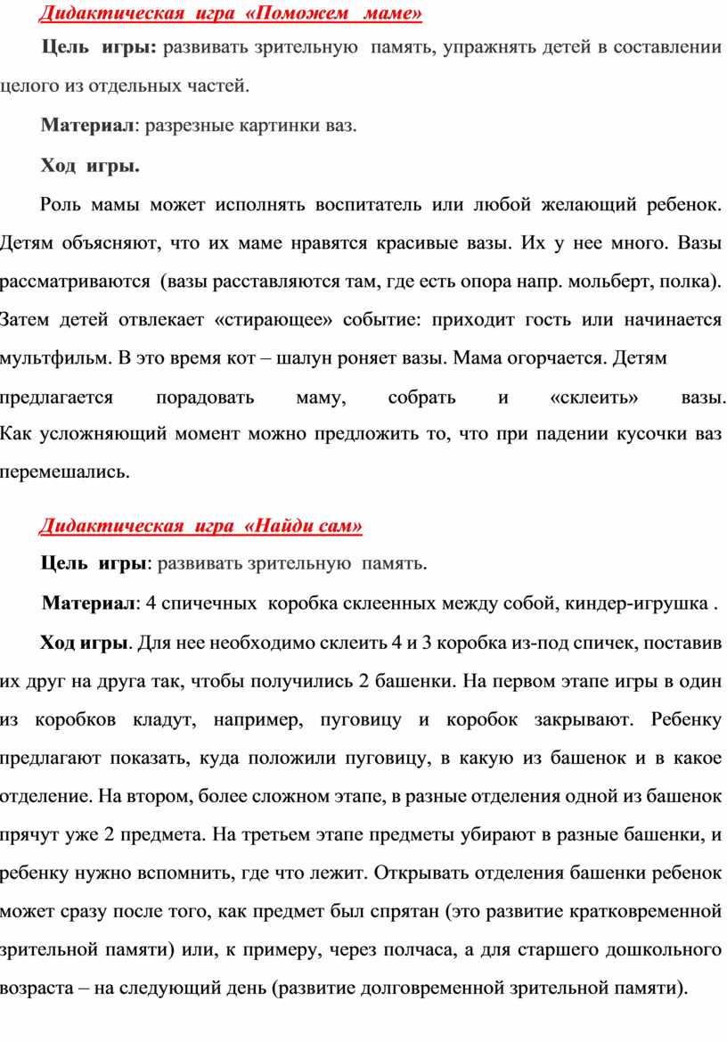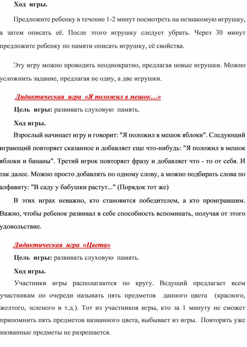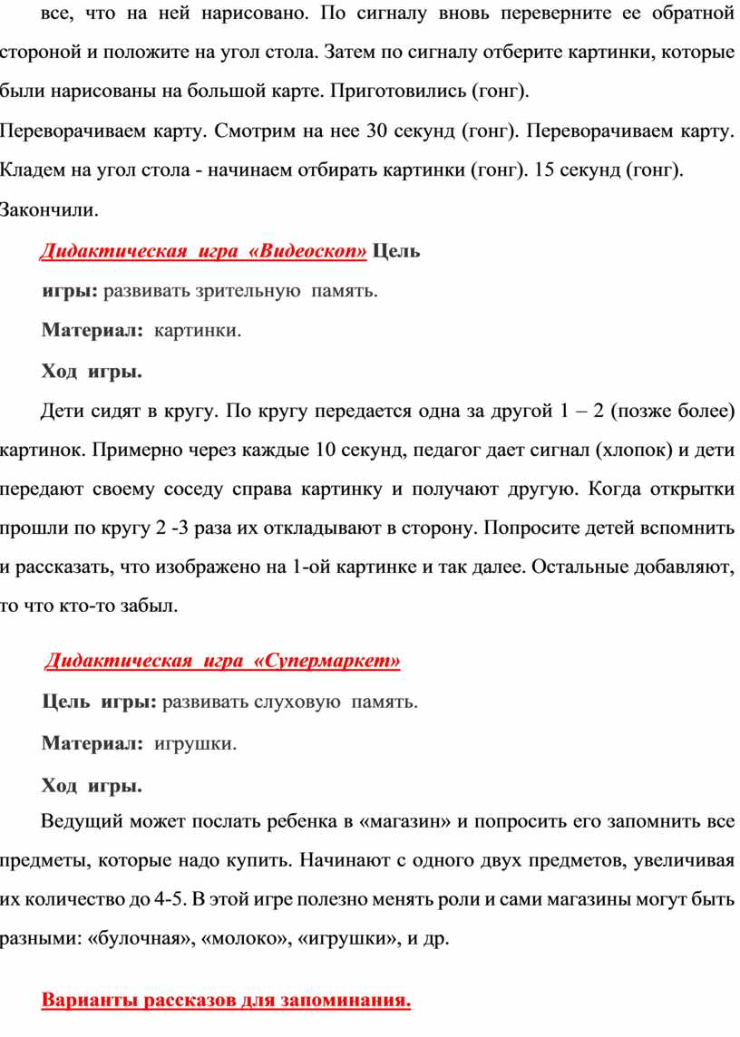 Важный момент в развитии произвольной памяти – обучение приемам запоминания. Именно шестилетние дети впервые принимают указания, как надо запоминать. Развитию памяти способствует дидактическая игра.