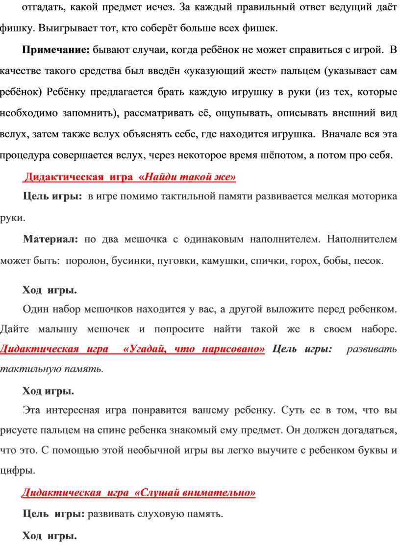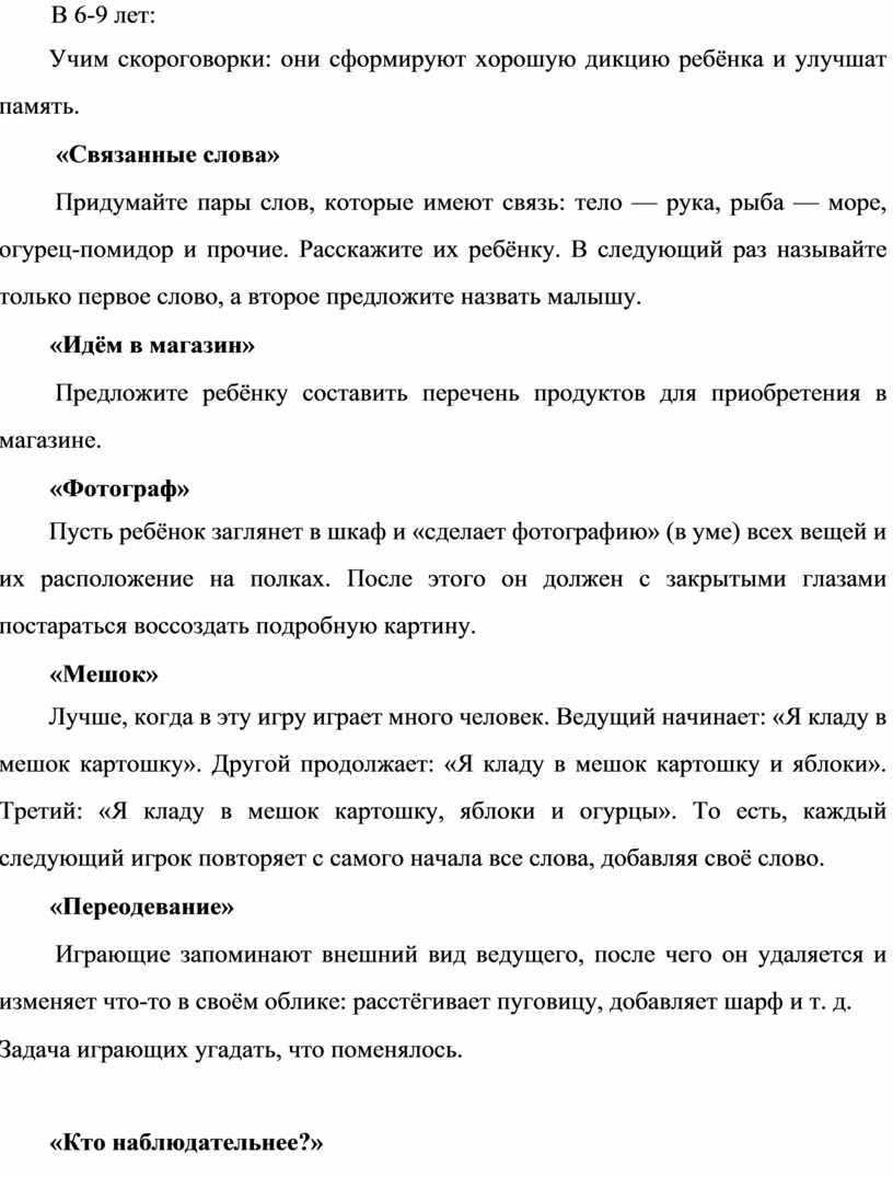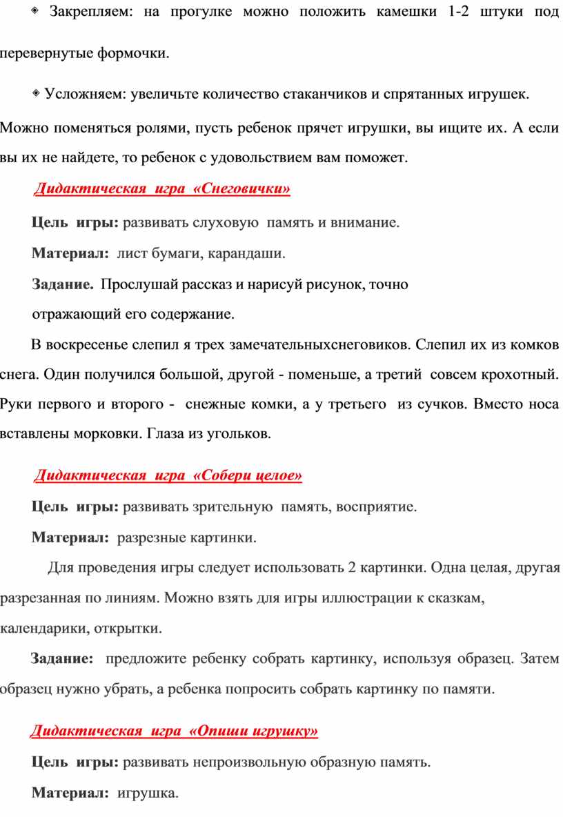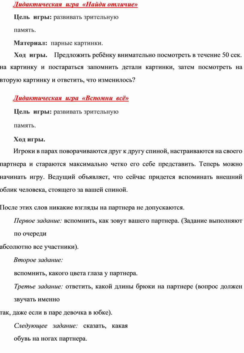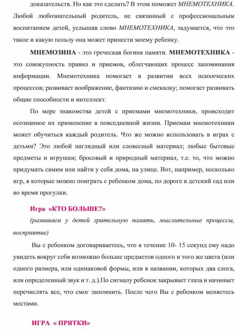 Важный момент в развитии произвольной памяти – обучение приемам запоминания. Именно шестилетние дети впервые принимают указания, как надо запоминать. Развитию памяти способствует дидактическая игра.