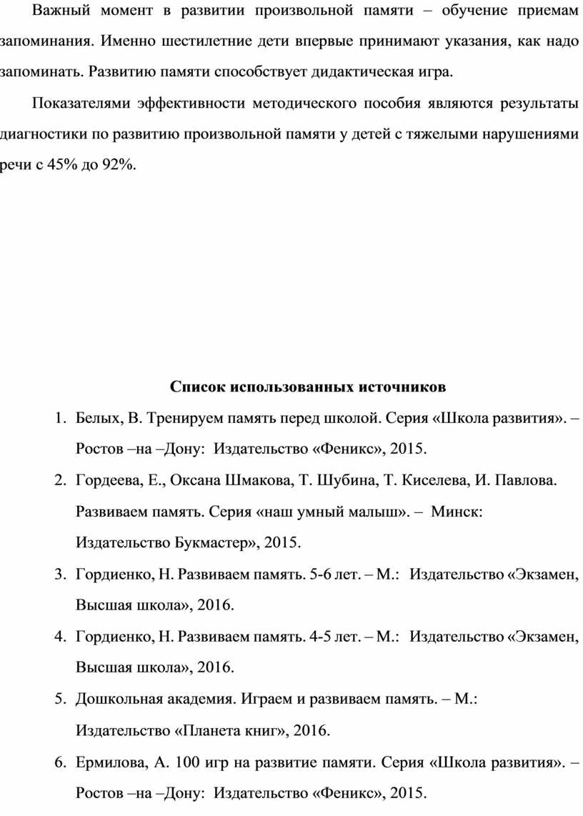 1. Белых, В. Тренируем память перед школой. Серия «Школа развития». – Ростов –на –Дону: Издательство «Феникс», 2015.