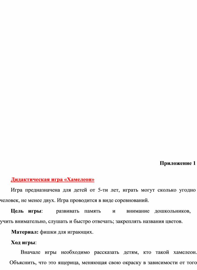Вначале игры необходимо рассказать детям, кто такой хамелеон. Объяснить, что это ящерица, меняющая свою окраску в зависимости от того места, где она находится, чтобы её не было заметно. Например, если хамелеон забрался на серый камень, то он станет серым, а если он сидит на жёлтом песке, то он станет жёлтым. Затем ведущий начинает задавать играющим вопросы, какого цвета станет хамелеон, если он будет сидеть: в зелёной траве, на коричневом бревне, на чёрном камне, на сером асфальте, на шахматной доске и т.д. Дети должны быстро отвечать, после чего анализируются правильные и неправильные ответы. В начале игры время ответа не учитывается, важно только правильно ответить, но затем вводится дополнительное условие, что победителем будет тот, кто быстрее всех даст правильный ответ. За каждый быстрый и правильный ответ играющий получает фишку. Выигрывает тот, кто наберёт больше всех фишек.