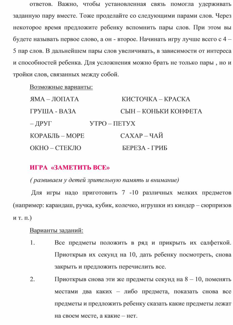 - находить смысловые связи между предъявляемыми объектами для заучивания и окружающими предметами.