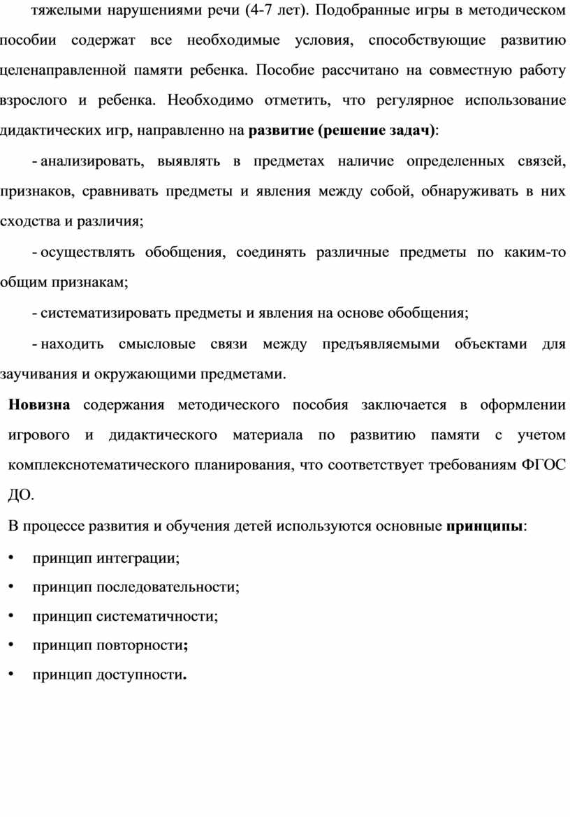 Новизна содержания методического пособия заключается в оформлении игрового и дидактического материала по развитию памяти с учетом комплекснотематического планирования, что соответствует требованиям ФГОС ДО.