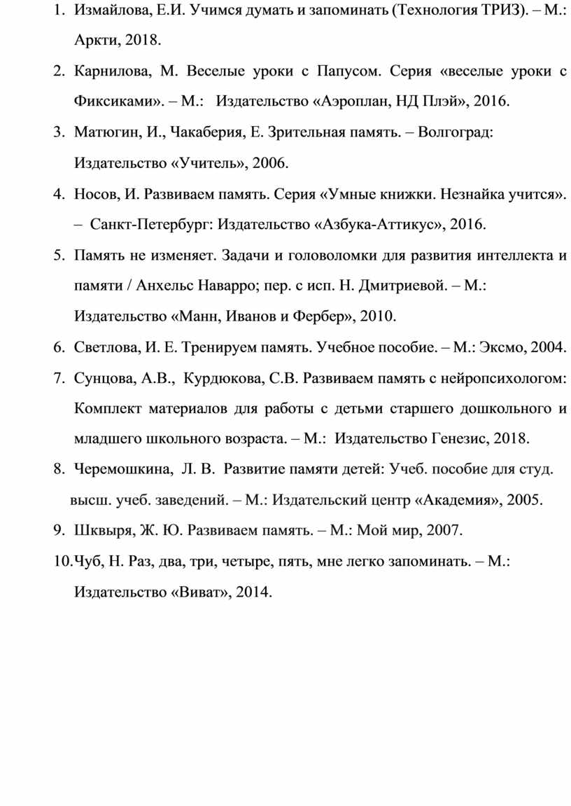 10. Носов, И. Развиваем память. Серия «Умные книжки. Незнайка учится». – Санкт-Петербург: Издательство «Азбука-Аттикус», 2016.