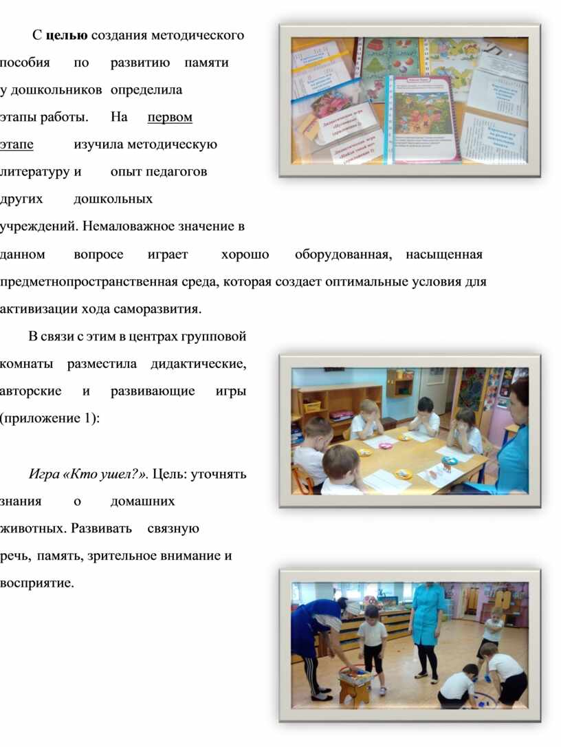 С целью создания методического пособия по развитию памяти у дошкольников определила этапы работы. На первом этапе изучила методическую литературу и опыт педагогов других дошкольных