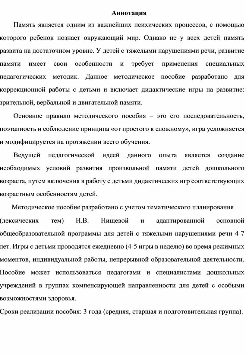 Память является одним из важнейших психических процессов, с помощью которого ребенок познает окружающий мир. Однако не у всех детей память развита на достаточном уровне. У детей с тяжелыми нарушениями речи, развитие памяти имеет свои особенности и требует применения специальных педагогических методик. Данное методическое пособие разработано для коррекционной работы с детьми и включает дидактические игры на развитие: зрительной, вербальной и двигательной памяти.