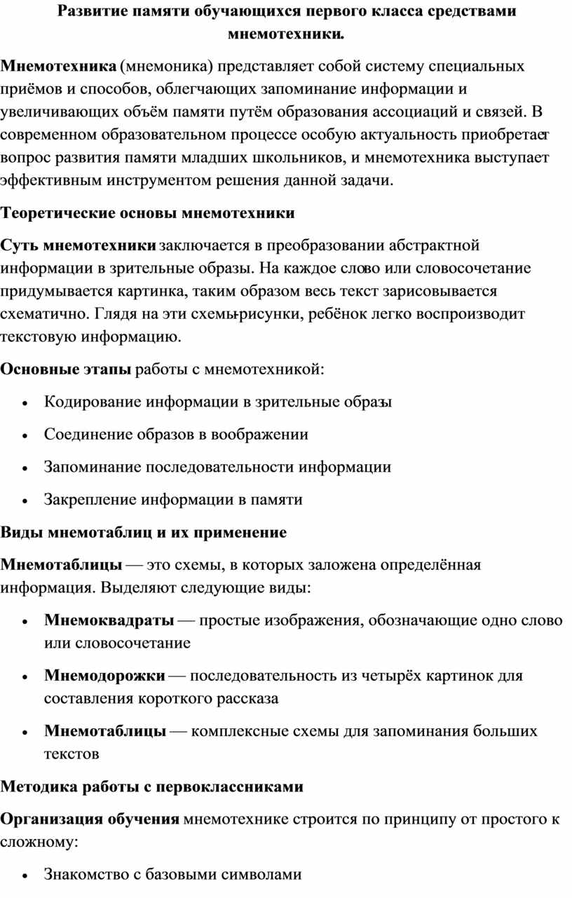 Мнемотехника (мнемоника) представляет собой систему специальных приёмов и способов, облегчающих запоминание информации и увеличивающих объём памяти путём образования ассоциаций и связей. В современном образовательном процессе особую актуальность приобретает вопрос развития памяти младших школьников, и мнемотехника выступает эффективным инструментом решения данной задачи.