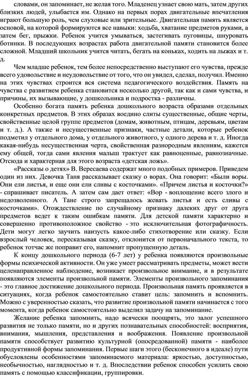 «Рассказы о детях» В. Вересаева содержат много подобных примеров. Приведем один из них. Девочка Таня рассказывает сказку о ворах. Она говорит: «Были воры. Они ели листья, и еще они ели сливы с косточками». «Причем листья и косточки?» - спрашивает писатель. А затем сам дает ответ: «Вор - воплощение всего злого и недозволенного. А Тане строго запрещалось жевать листья и есть сливы с косточками». Отождествление по случайному признаку далеких друг от друга предметов ведет к таким ошибкам памяти. Для детской памяти характерно и совершенно противоположное свойство - это исключительная фотографичность. Дети могут легко заучить наизусть какое-либо стихотворение или сказку. Если взрослый человек, пересказывая сказку, отклонится от первоначального текста, то ребенок тотчас же поправит его, напомнит пропущенную деталь.