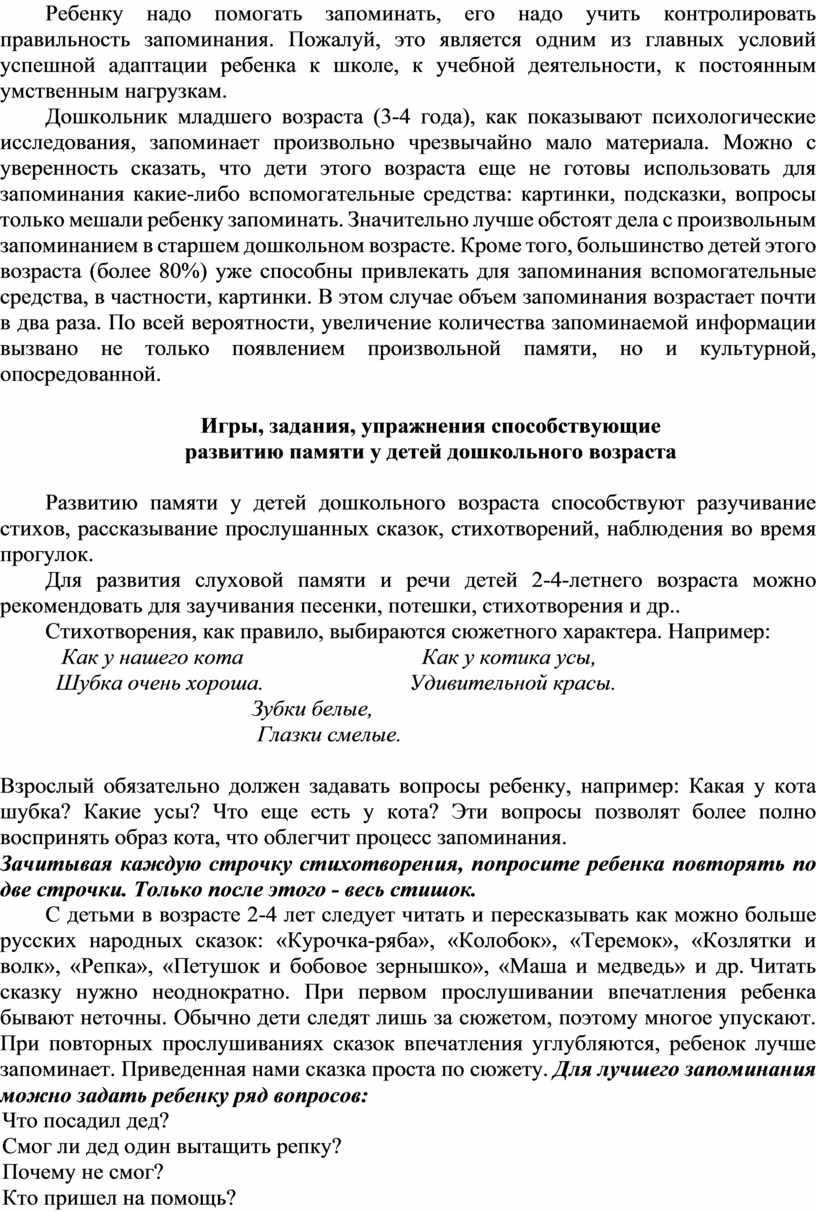 Дошкольник младшего возраста (3-4 года), как показывают психологические исследования, запоминает произвольно чрезвычайно мало материала. Можно с уверенность сказать, что дети этого возраста еще не готовы использовать для запоминания какие-либо вспомогательные средства: картинки, подсказки, вопросы только мешали ребенку запоминать. Значительно лучше обстоят дела с произвольным запоминанием в старшем дошкольном возрасте. Кроме того, большинство детей этого возраста (более 80%) уже способны привлекать для запоминания вспомогательные средства, в частности, картинки. В этом случае объем запоминания возрастает почти в два раза. По всей вероятности, увеличение количества запоминаемой информации вызвано не только появлением произвольной памяти, но и культурной, опосредованной.