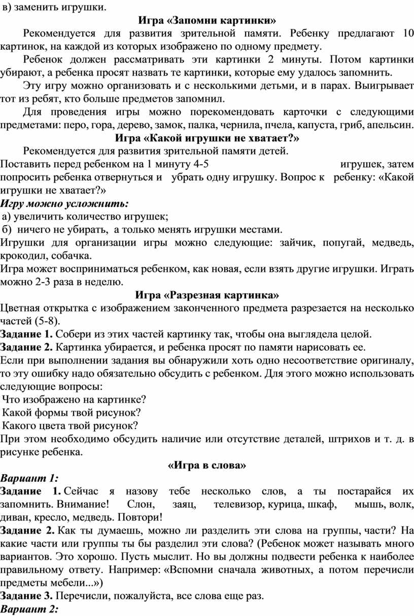 Поставить перед ребенком на 1 минуту 4-5 игрушек, затем попросить ребенка отвернуться и убрать одну игрушку. Вопрос к ребенку: «Какой игрушки не хватает?»