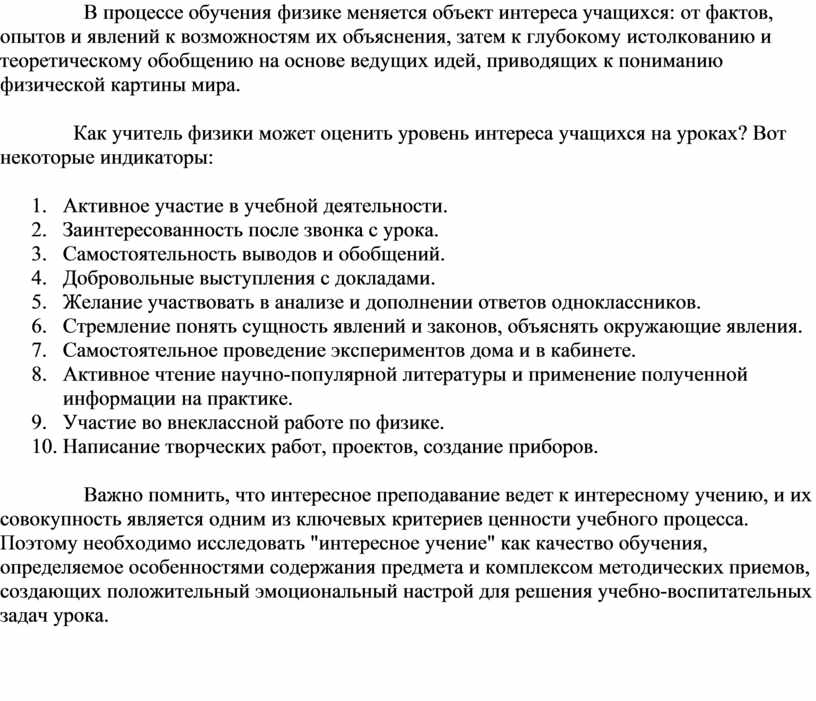 Как учитель физики может оценить уровень интереса учащихся на уроках? Вот некоторые индикаторы: