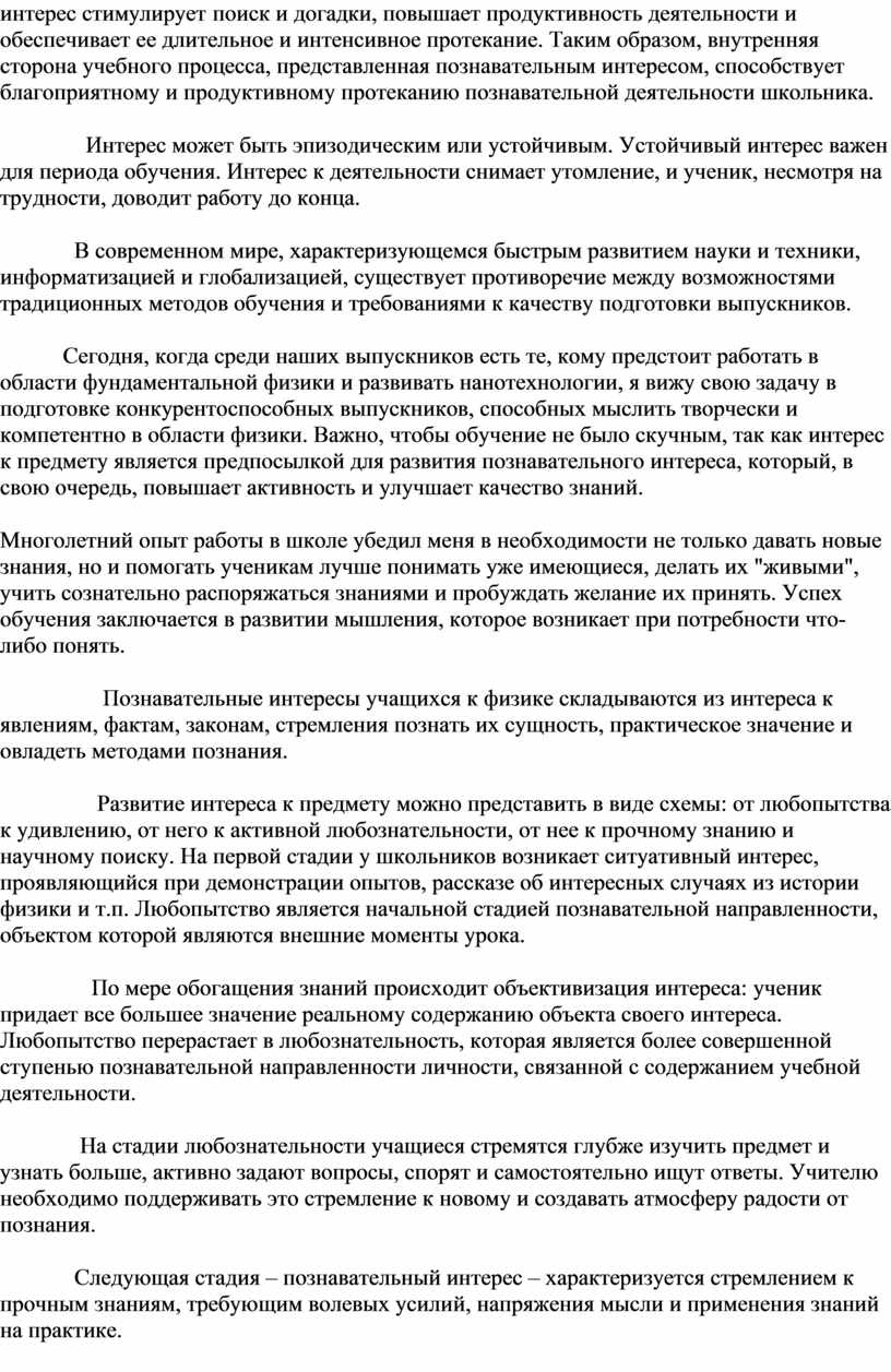 Развитие интереса к предмету можно представить в виде схемы: от любопытства к удивлению, от него к активной любознательности, от нее к прочному знанию и научному поиску. На первой стадии у школьников возникает ситуативный интерес, проявляющийся при демонстрации опытов, рассказе об интересных случаях из истории физики и т.п. Любопытство является начальной стадией познавательной направленности, объектом которой являются внешние моменты урока.