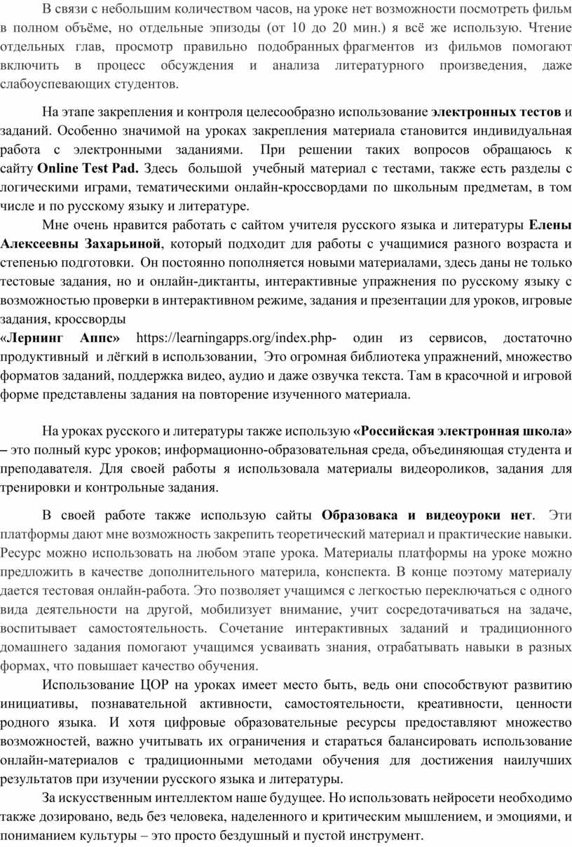 Использование ЦОР на уроках имеет место быть, ведь они способствуют развитию инициативы, познавательной активности, самостоятельности, креативности, ценности родного языка. И хотя цифровые образовательные ресурсы предоставляют множество возможностей, важно учитывать их ограничения и стараться балансировать использование онлайн-материалов с традиционными методами обучения для достижения наилучших результатов при изучении русского языка и литературы.