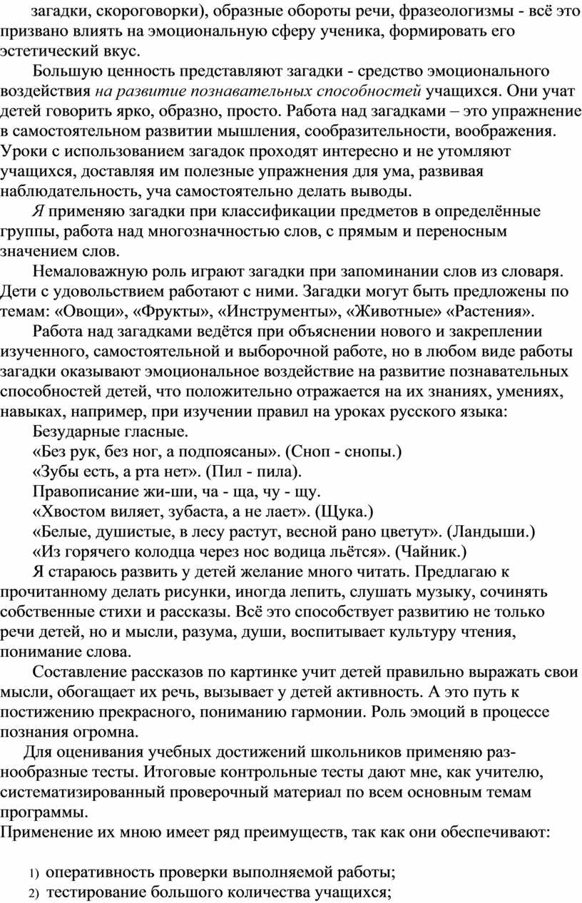 Работа над загадками ведётся при объяснении нового и закреплении изученного, самостоятельной и выборочной работе, но в любом виде работы загадки оказывают эмоциональное воздействие на развитие познавательных способностей детей, что положительно отражается на их знаниях, умениях, навыках, например, при изучении правил на уроках русского языка: