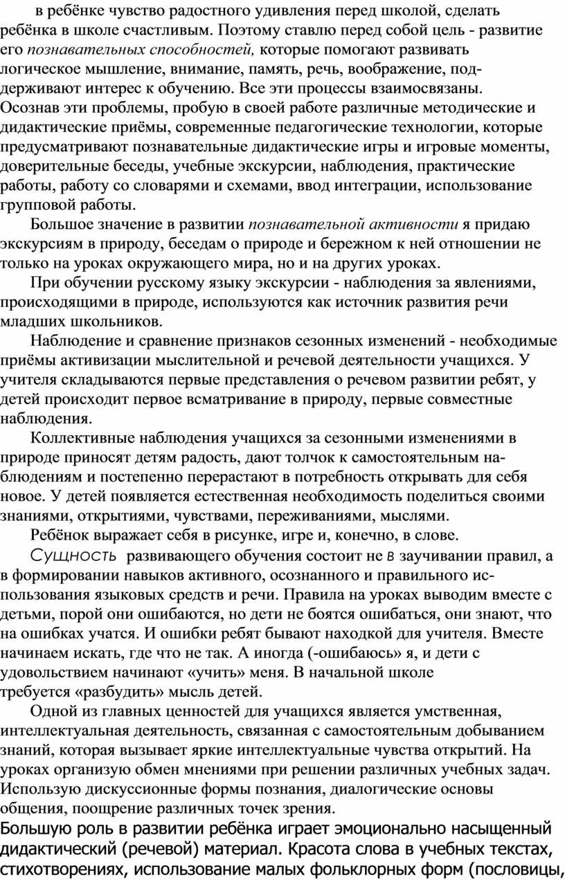 Большое значение в развитии познавательной активности я придаю экскурсиям в природу, беседам о природе и бережном к ней отношении не только на уроках окружающего мира, но и на других уроках.