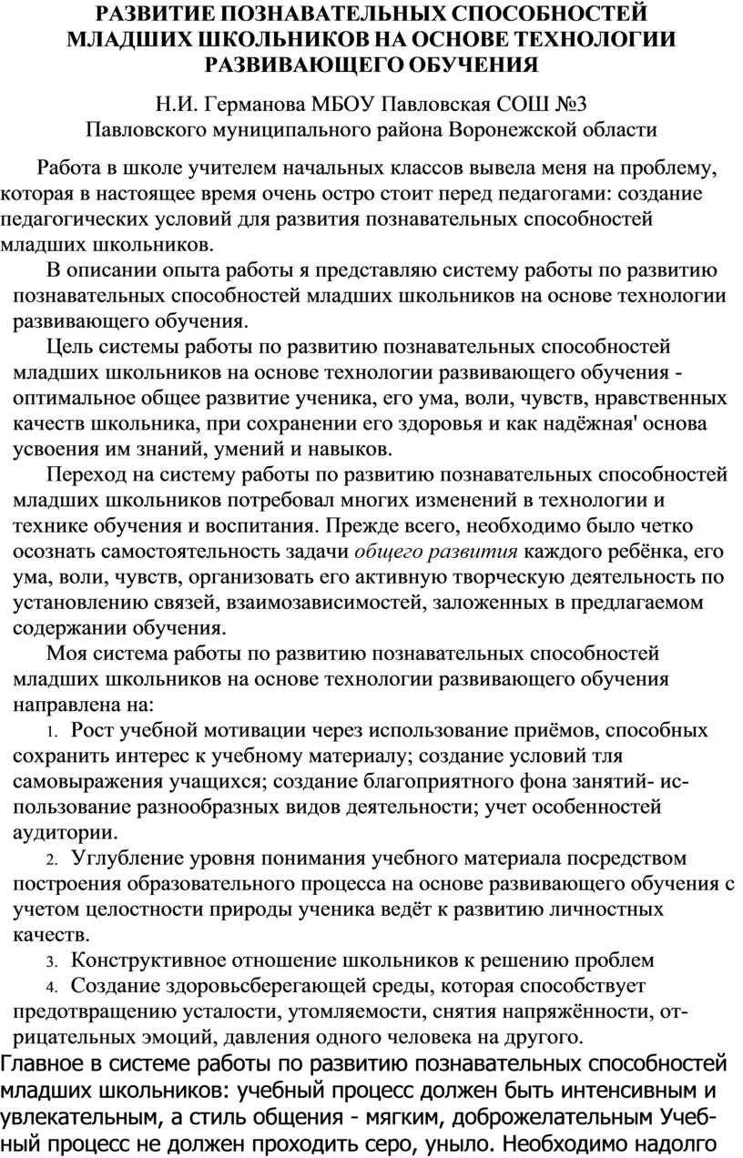 В описании опыта работы я представляю систему работы по развитию познавательных способностей младших школьников на основе технологии развивающего обучения.