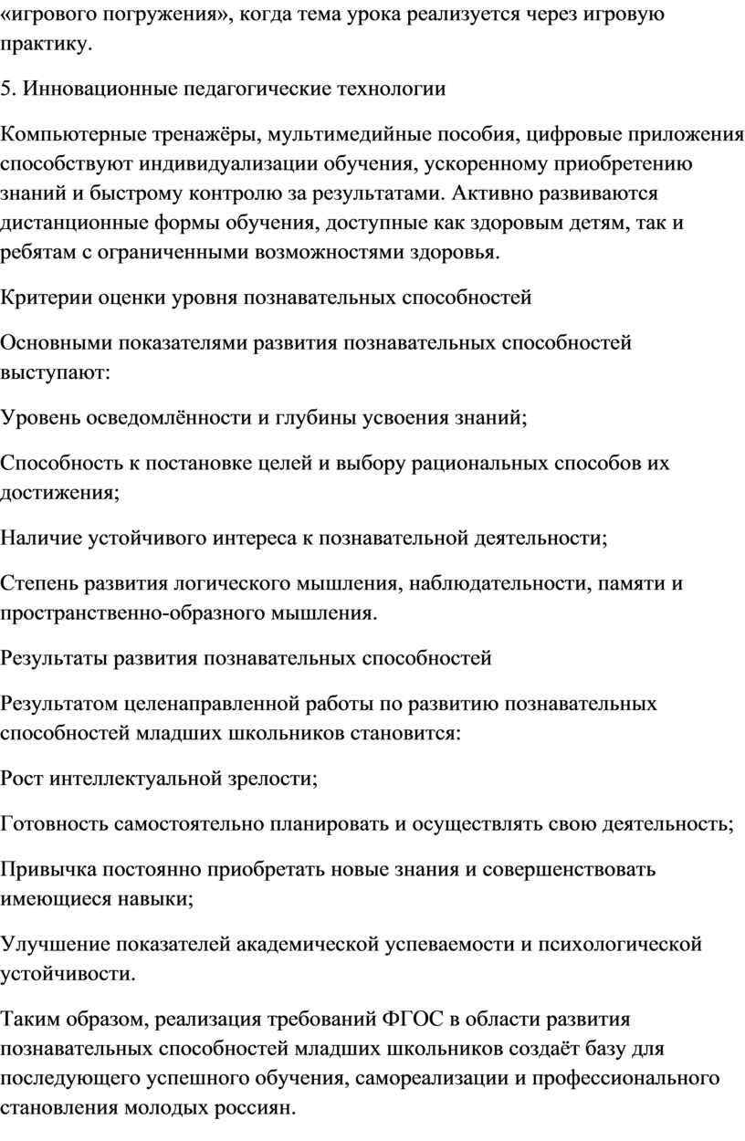 Таким образом, реализация требований ФГОС в области развития познавательных способностей младших школьников создаёт базу для последующего успешного обучения, самореализации и профессионального становления молодых россиян.