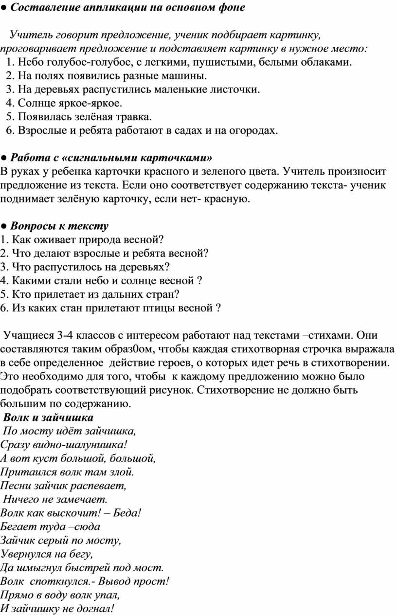 4. Практическое овладение материалом текста и использование его в самостоятельных высказываниях учащихся. Один и тот же текст можно использовать в разных классах, добавляя задания, новые предложения или наоборот, исключая те, которые трудны для восприятия ребят. Чем выше уровень речевого развития ребенка, тем более сложный материал можно ему предложить.