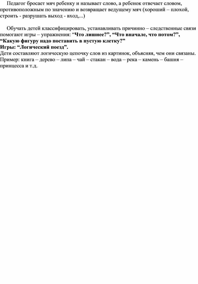 Обучать детей классифицировать, устанавливать причинно – следственные связи помогают игры – упражнения: “Что лишнее?”, “Что вначале, что потом?”, “Какую фигуру надо поставить в пустую клетку?”