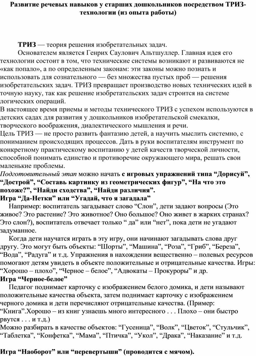 Развитие речевых навыков у старших дошкольников посредством ТРИЗ-технологии (из опыта работы)