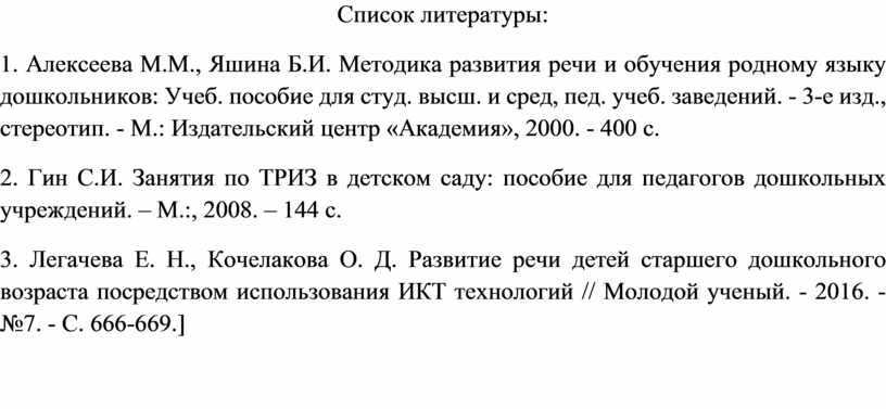 1. Алексеева М.М., Яшина Б.И. Методика развития речи и обучения родному языку дошкольников: Учеб. пособие для студ. высш. и сред, пед. учеб. заведений. - 3-е изд., стереотип. - М.: Издательский центр «Академия», 2000. - 400 с.